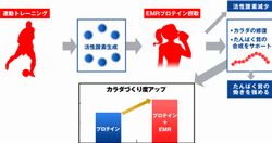 肉や魚などの、食事で摂取したたんぱく質の働きを強めるので、より効率的なカラダづくりに役立ちます。 『EMR』は筑波大学・早稲田大学と共同研究によって発見されました。科学的な根拠のある『EMR』で、強いカラダ作りをしましょう!