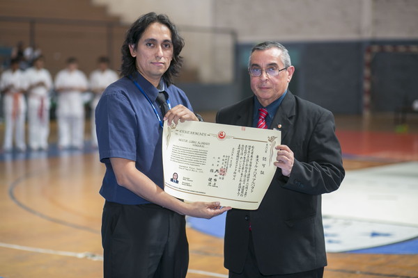 また、表彰式後には、今年3月に支部長に昇格したネストル・クバス・アルバラド支部長が、ゴンザレス師範より支部認可証を授与されました。