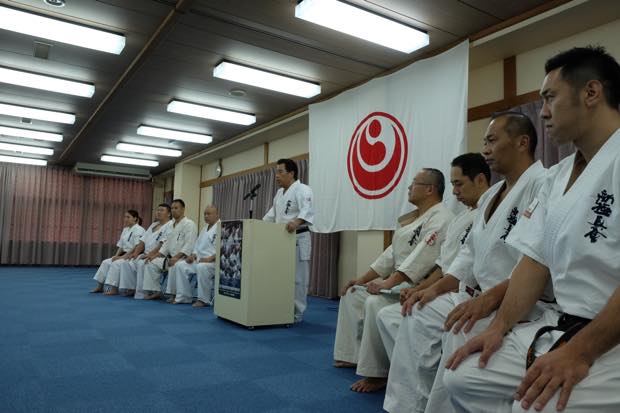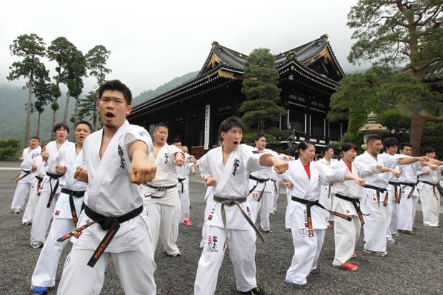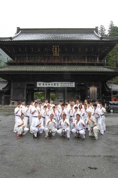 合宿最終日となる三日目は大山倍達総裁所縁の地である身延山久遠寺において必勝祈願と稽古をおこないました。荘厳な本堂での必勝祈願のあと、久遠寺に御許可をいただいて境内で稽古をおこないました。最後にアニメ版空手バカ一代のオープニングに登場する山門の前で記念撮影をおこない稽古をしめくくりました。
