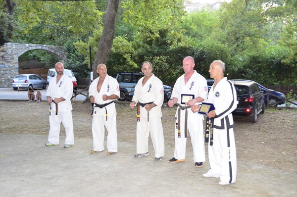 At the end of the exam, honorary plaques were awarded to two guest teachers, Shihan Pedro Soriano and Master Vasili Alexandris, while participation certificates were given to everyone with a commemorative T-shirt of the Camp, offering local Volos donor (Tsipouradiko “ The friends “, Grappa Café, Tasty Corner and Mpaxariko). Also presented the prize of degrees and gold-embroidered belt from the WKO Headquarters in Japan, to those who passed the examinations and promoted at the winter camp in January in Chania Pelion.