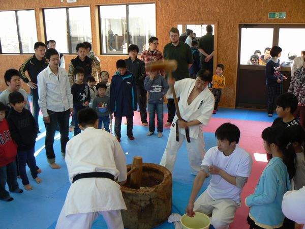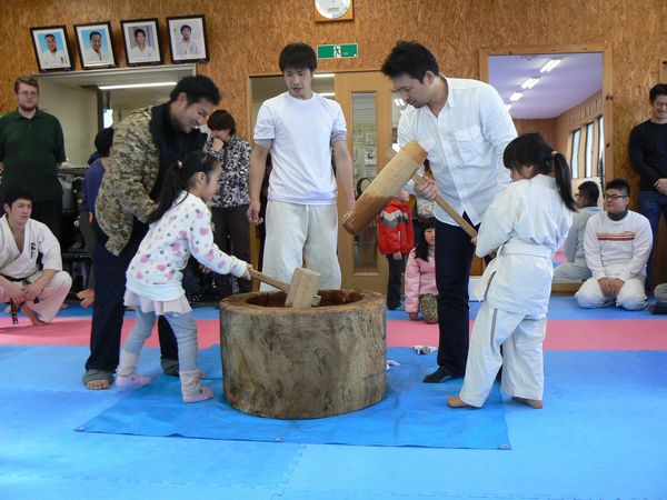 さっきまで、気合が聞こえていた道場にはいつの間にか臼と杵が準備されていました。