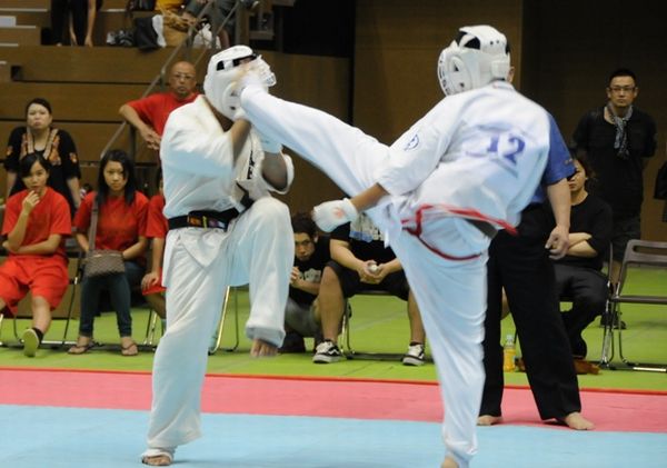 試合中盤、突きの連打で一気呵成に攻め込む犬塚に、大坪のカウンター上段廻し蹴りがさく裂!