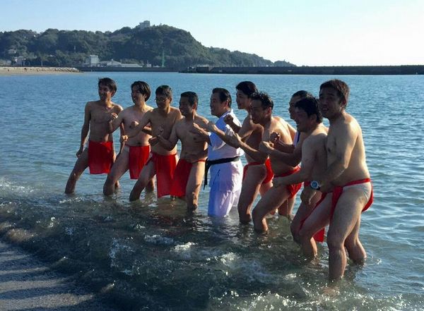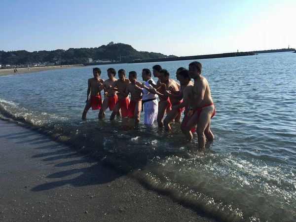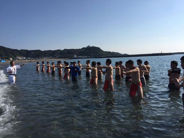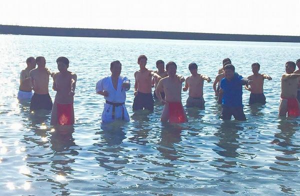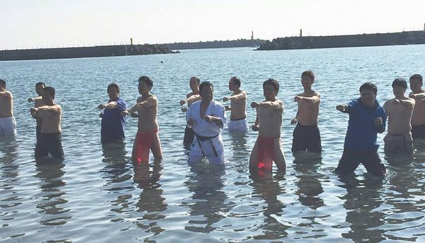 稽古のクライマックス、海の中での100本突き!