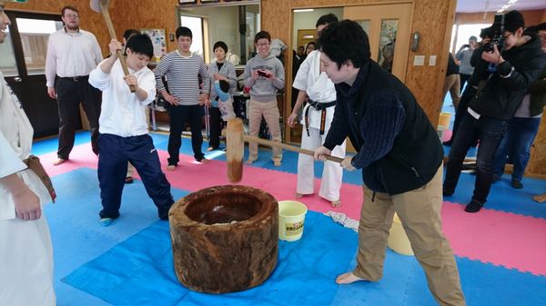 さて、白河道場の鏡開き稽古の後半は立派な臼と杵をつかっての餅つき、そして酒宴です。