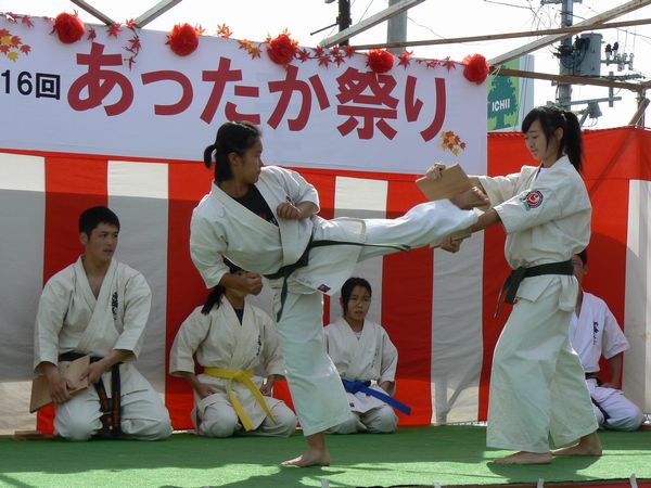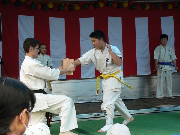 演武内容としては、基本稽古から始まり→型→ミット打ち→組手→試割りという流れで披露し、最後は唯一参加してくれた高校生の小林祐花(3級)による二方割りで会場を沸かせ、全員の正拳中段突きで締めくくりました。