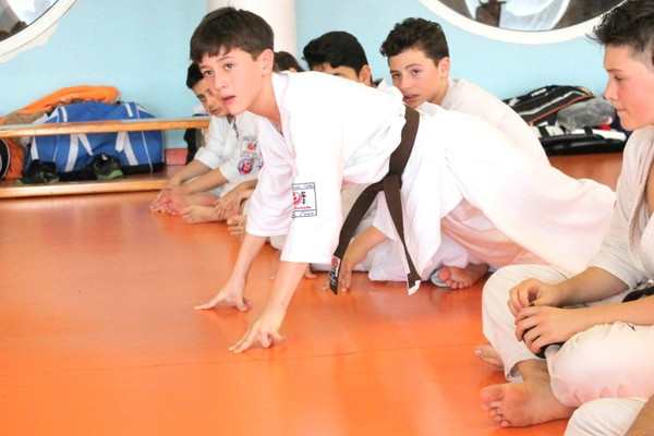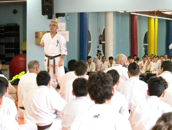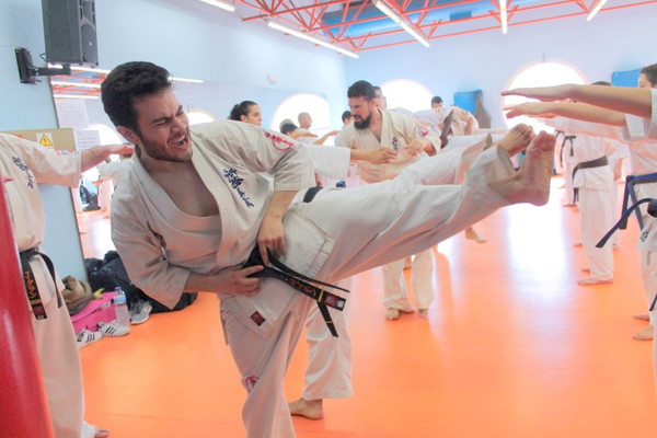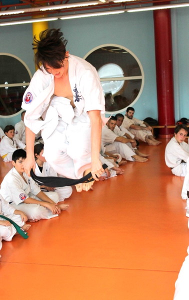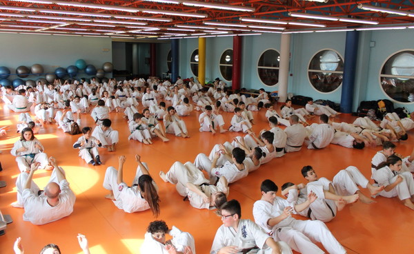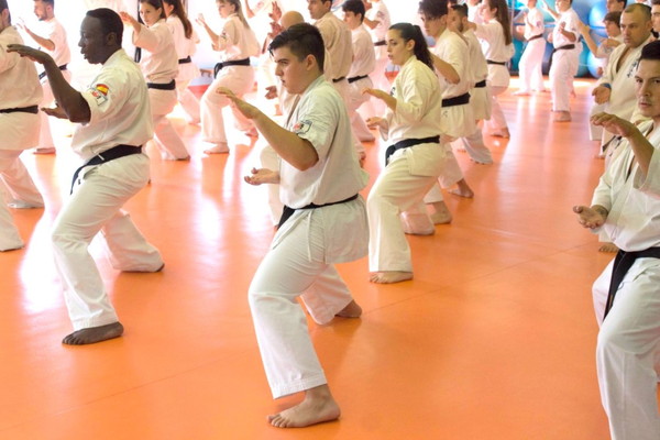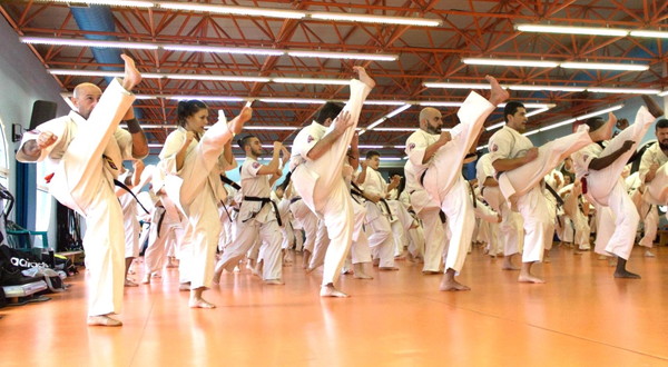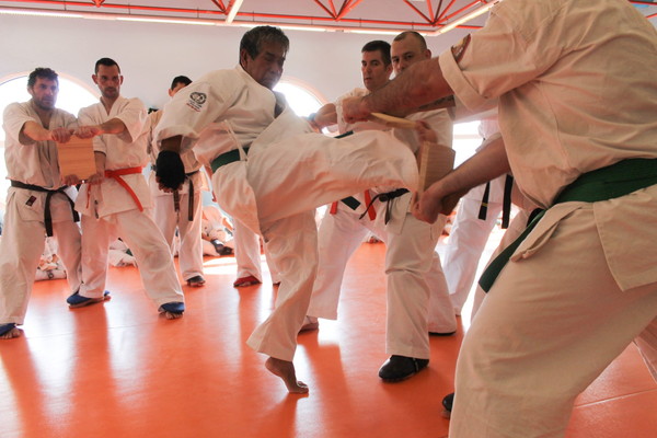 The stamina phase is very special for Shihan Jesus Talán and his hard requirements are famous: for juniors and seniors, 100 push-ups, 120 sit-ups, 20 push-ups on two fingers, 100 squats, 30 jumps over a belt folded three times, and especially kicking Geri of Keage, Mae, Yoko, Soto and Uchi, with a total of 800 repetitions.