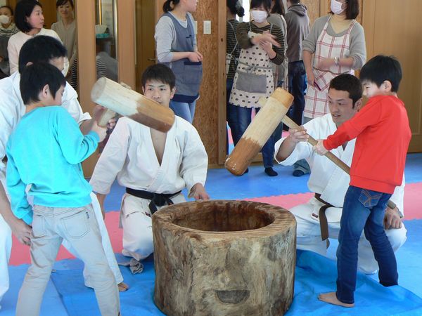 稽古も終わり、餅つきが始まり黒帯、色帯、子供たちの順番で餅つきを行い、自分も餅をつかせて頂きました。