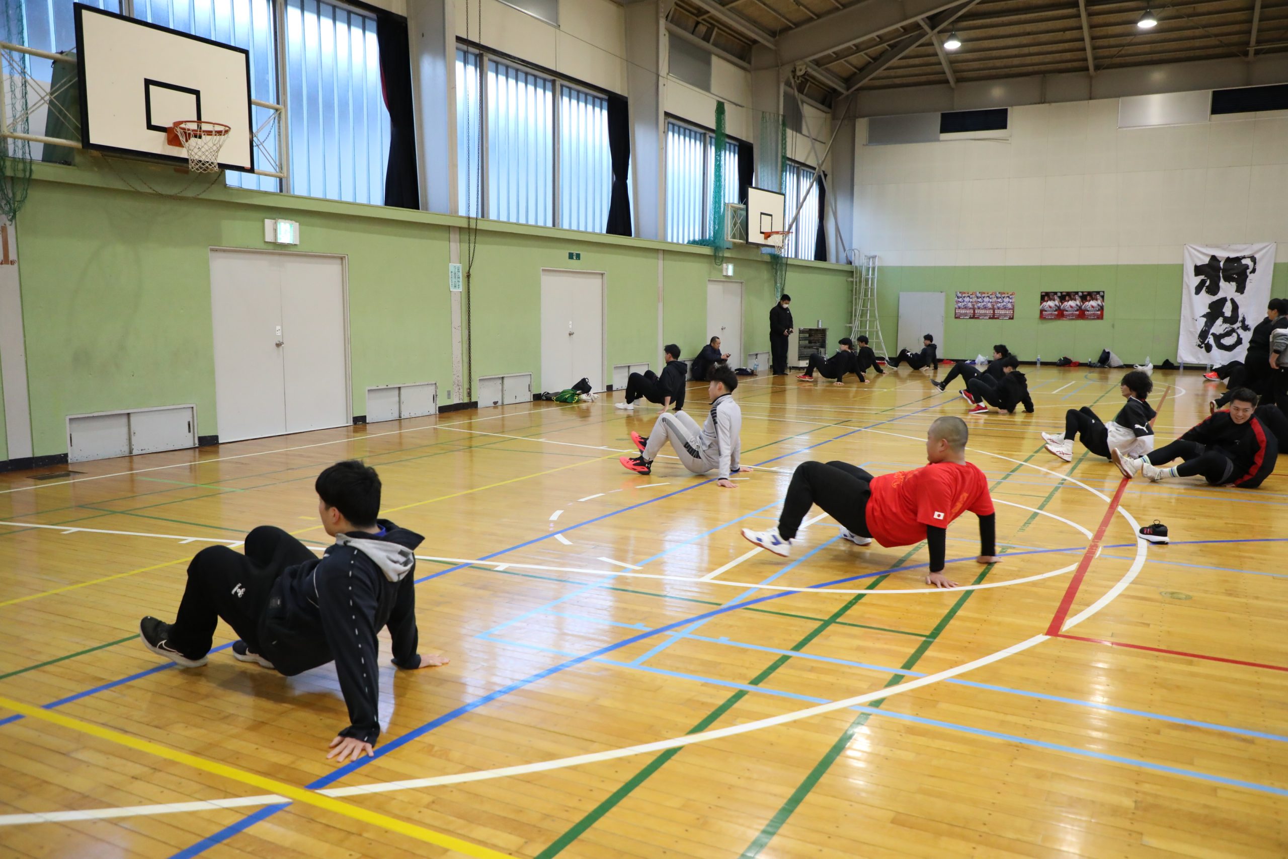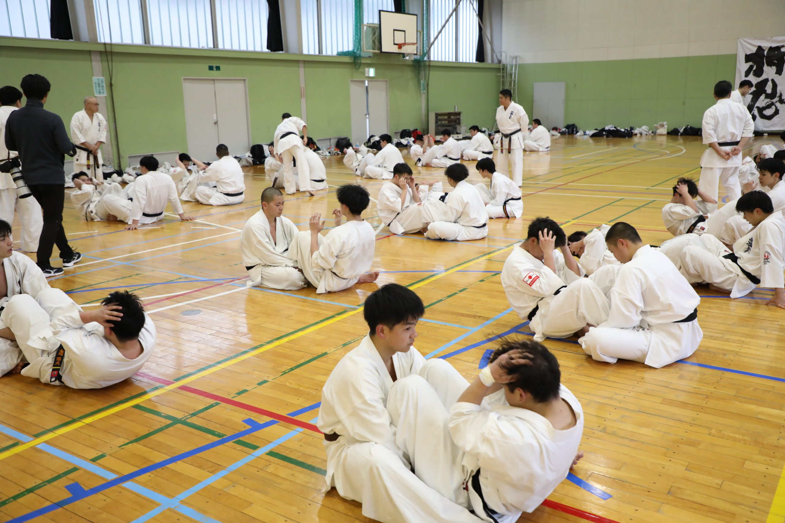 組手を終えると、補強トレーニングで肉体をいじめ抜いた。まずは2人組で腹筋を100回実施。スピードも重視して行なわれ、終わった選手から立ち上がる方式で腹筋運動の速さを競った。