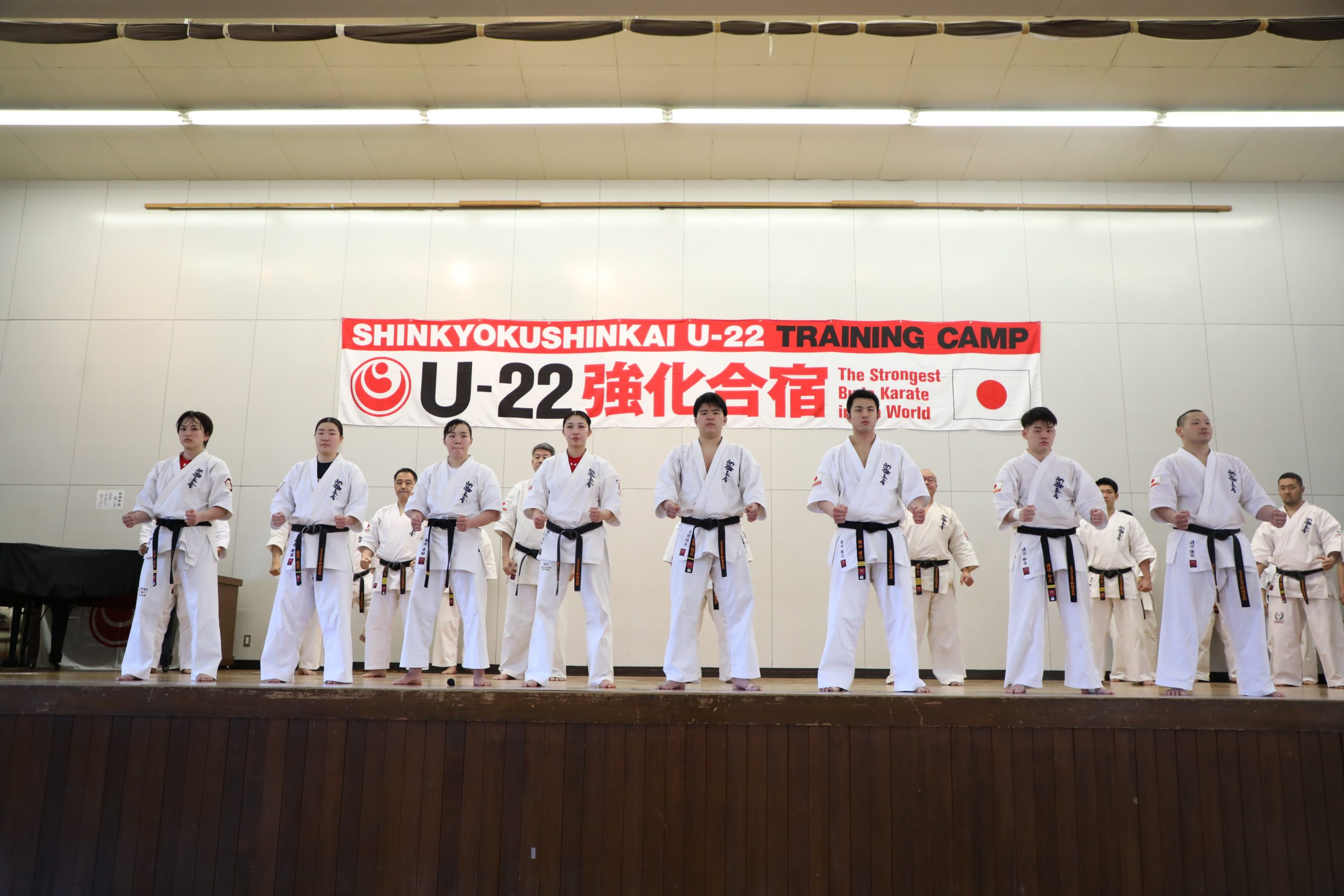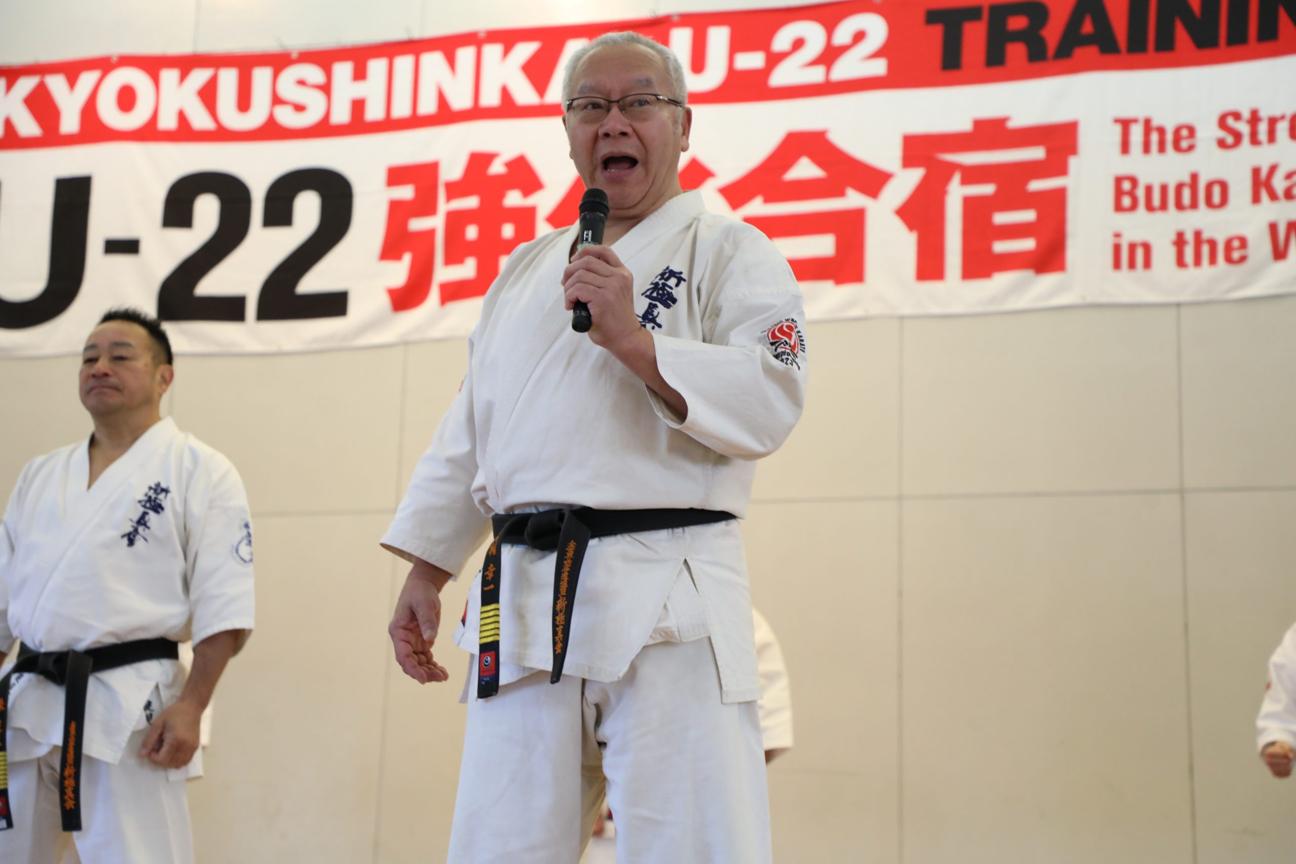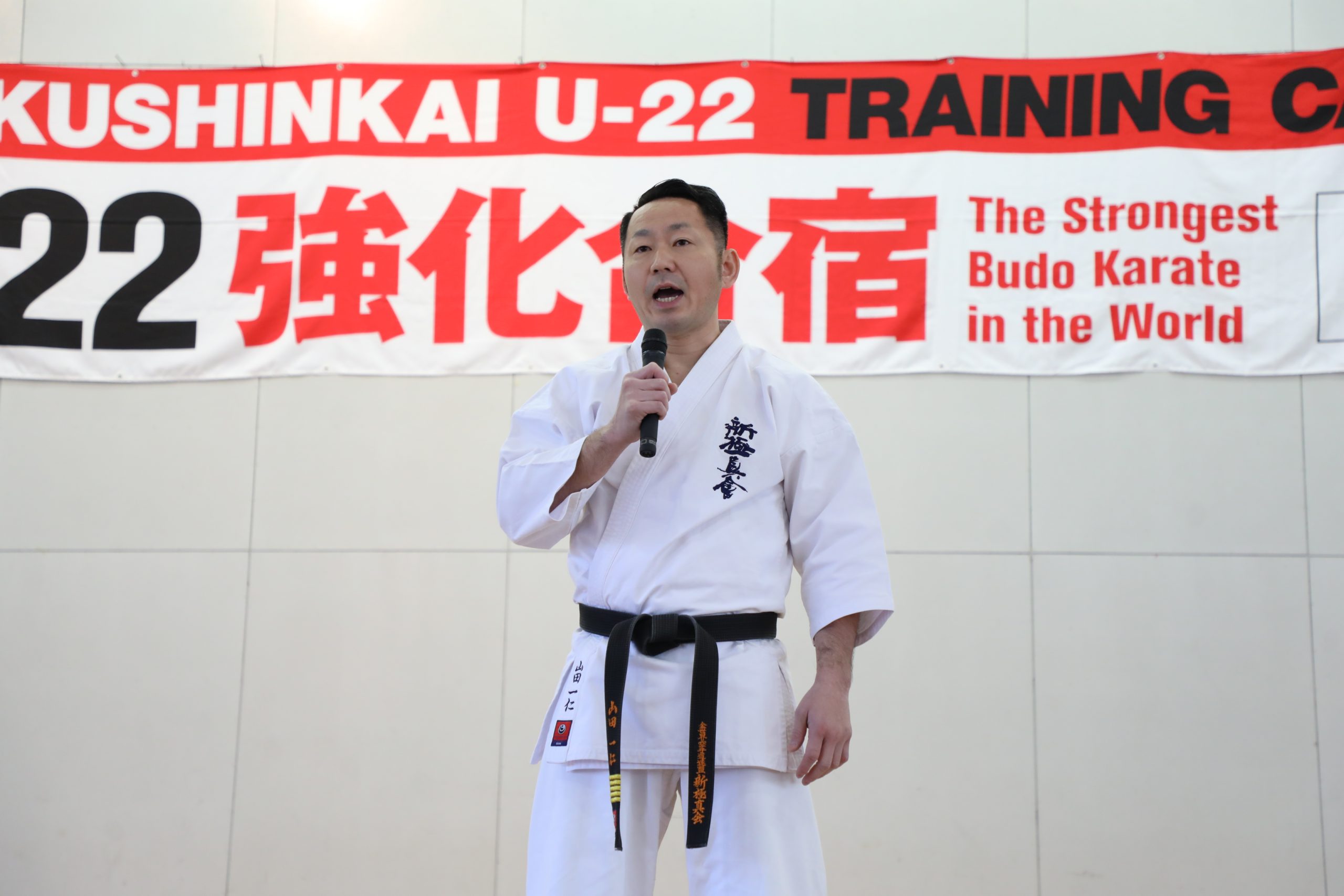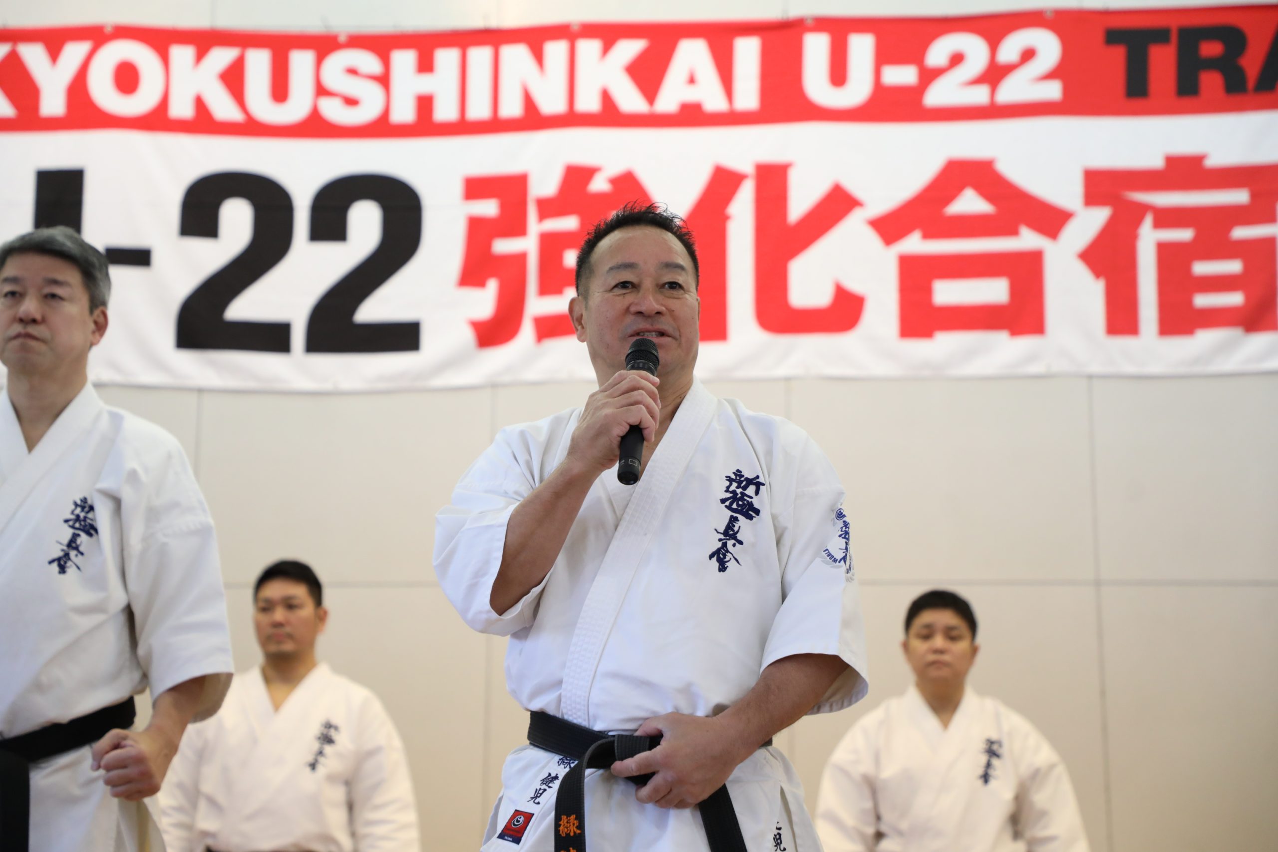 選手強化委員長に就任した奥村幸一師範は「U-22強化合宿は今回が5回目になります。この合宿はJFKO設立を経て、第1回JFKO全日本大会が開催された2014年に、塚本師範の発案で始まりました。JFKO全日本で勝つために、そして世界大会につなげるために精鋭を集めたのがU-22強化合宿です。この合宿が何のためにあるのか。もう一度噛みしめてください。来年は世界大会の日本代表選手団が決定します。いろいろな人の思いを背負い、新極真会のために目標を達成しましょう。3日間、命をかけてがんばってください」と檄を飛ばした。