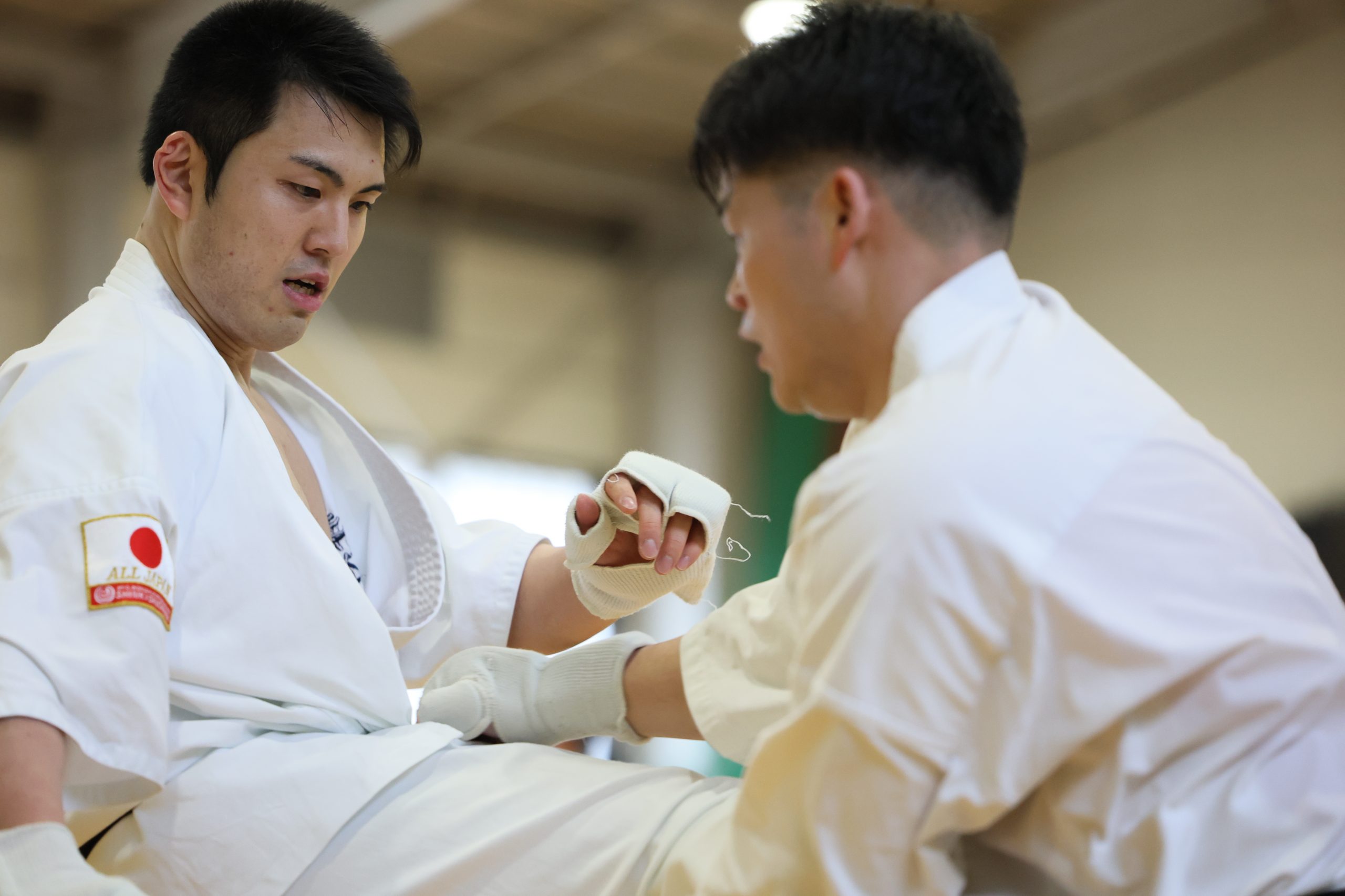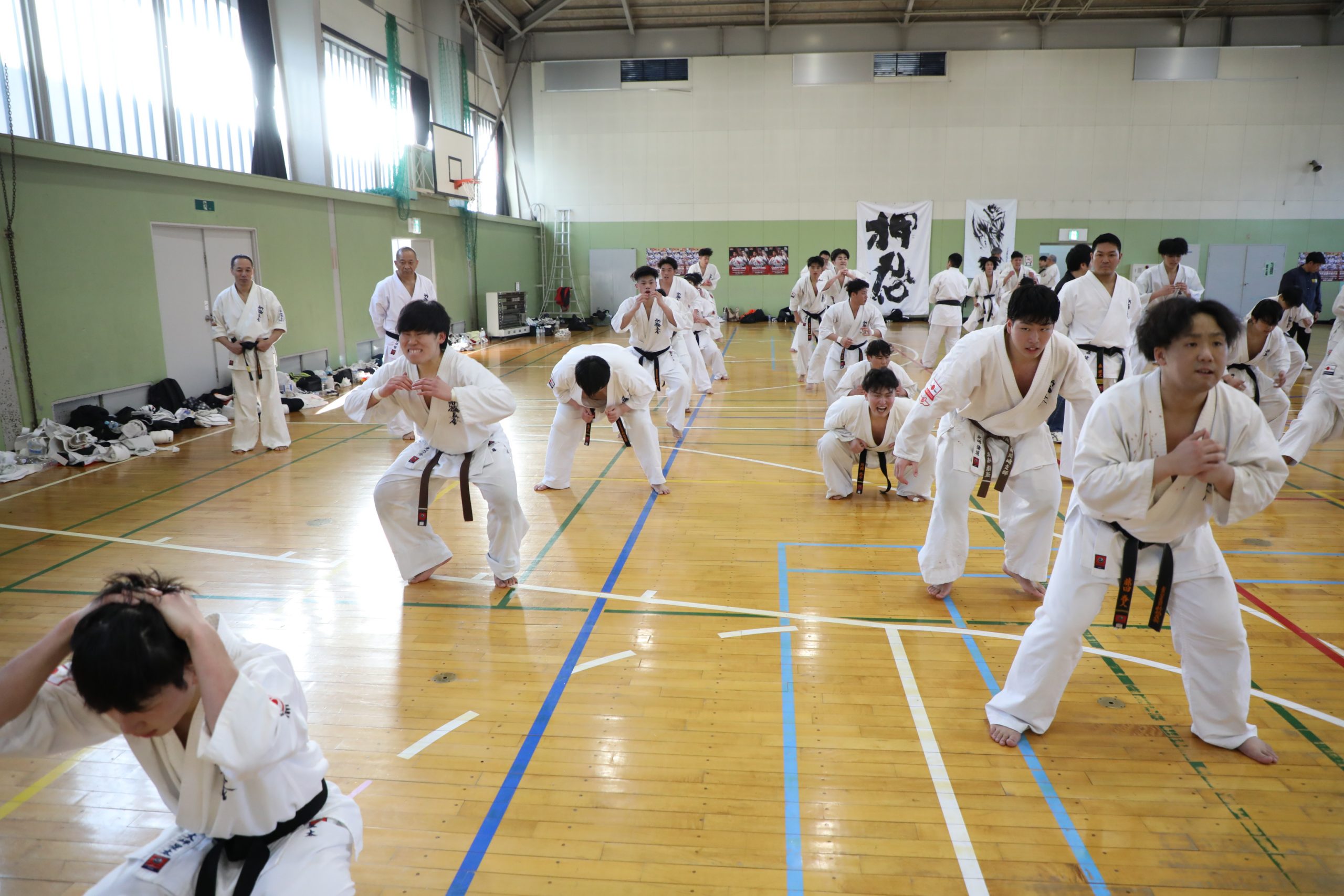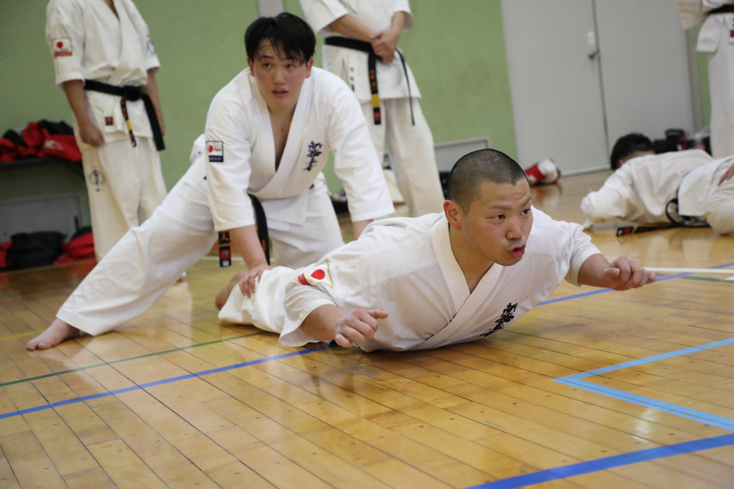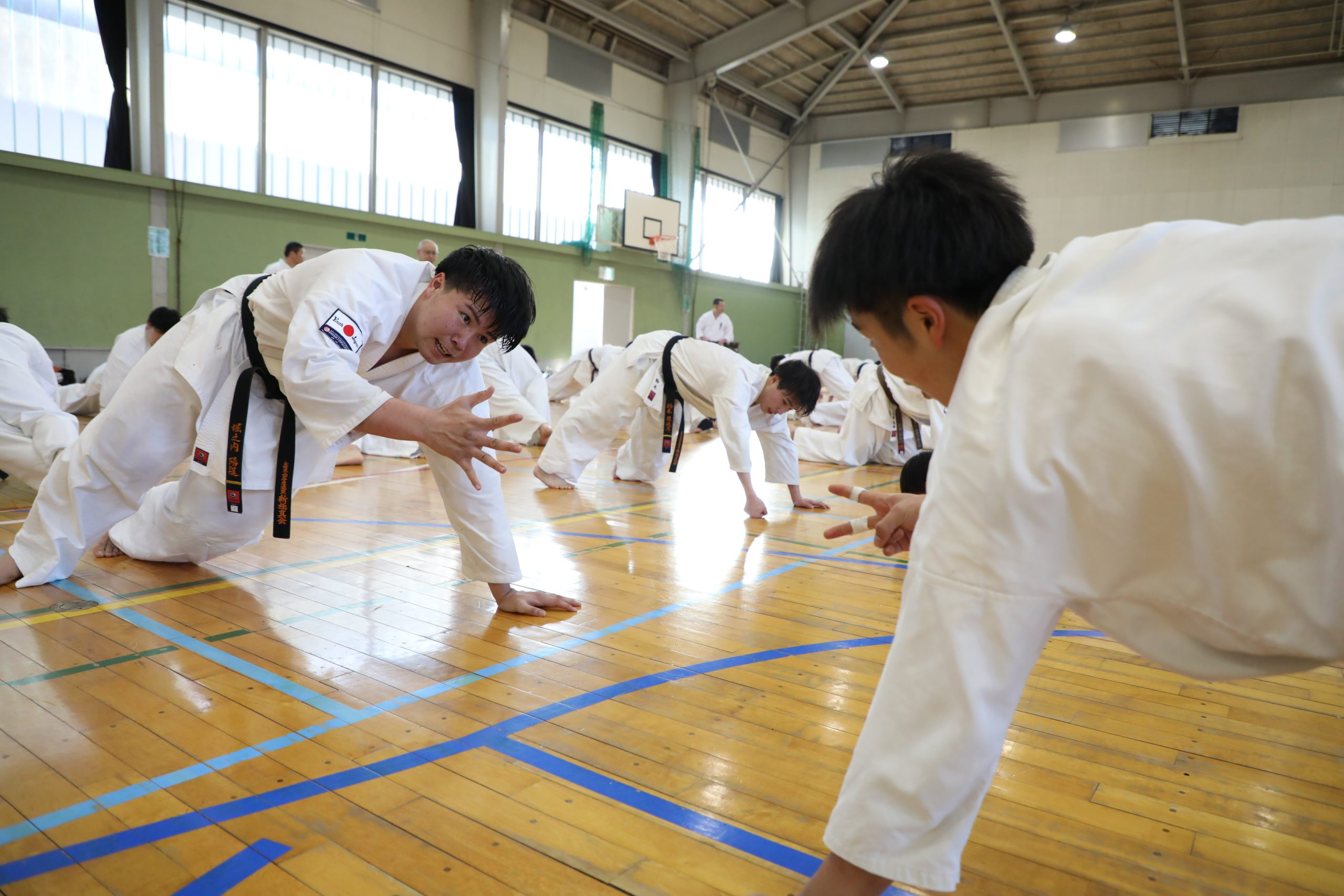 その後は補強トレーニングへ移る。拳立て伏せは2人1組で正面から向き合う形となり、じゃんけんで勝ったほうは10回、負けたほうは30回が課せられ、それを3分間繰り返した。ジャンピングスクワット100回の後は、階級別に分かれて腹打ちを20秒。相手を変えながら3セット行ない、過酷な3時間の稽古が終了した。