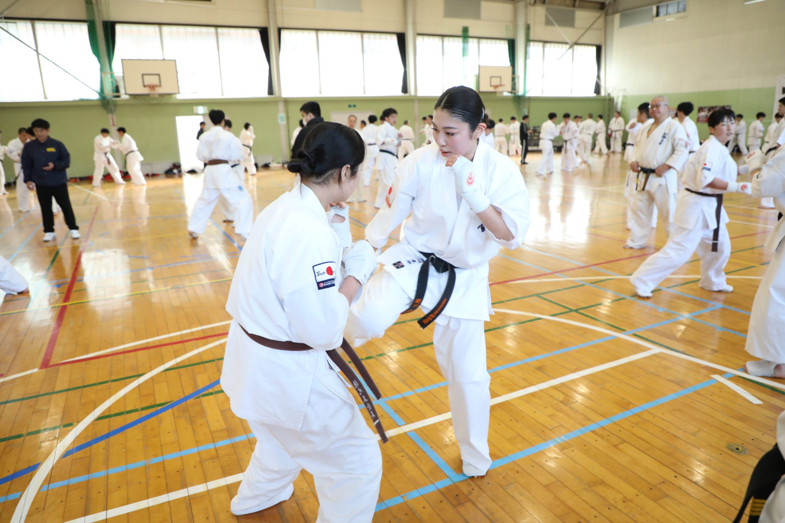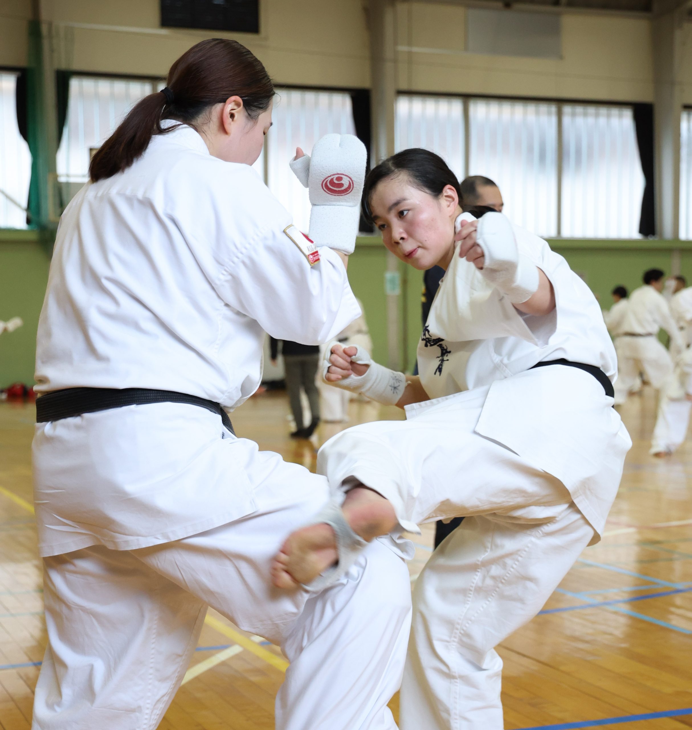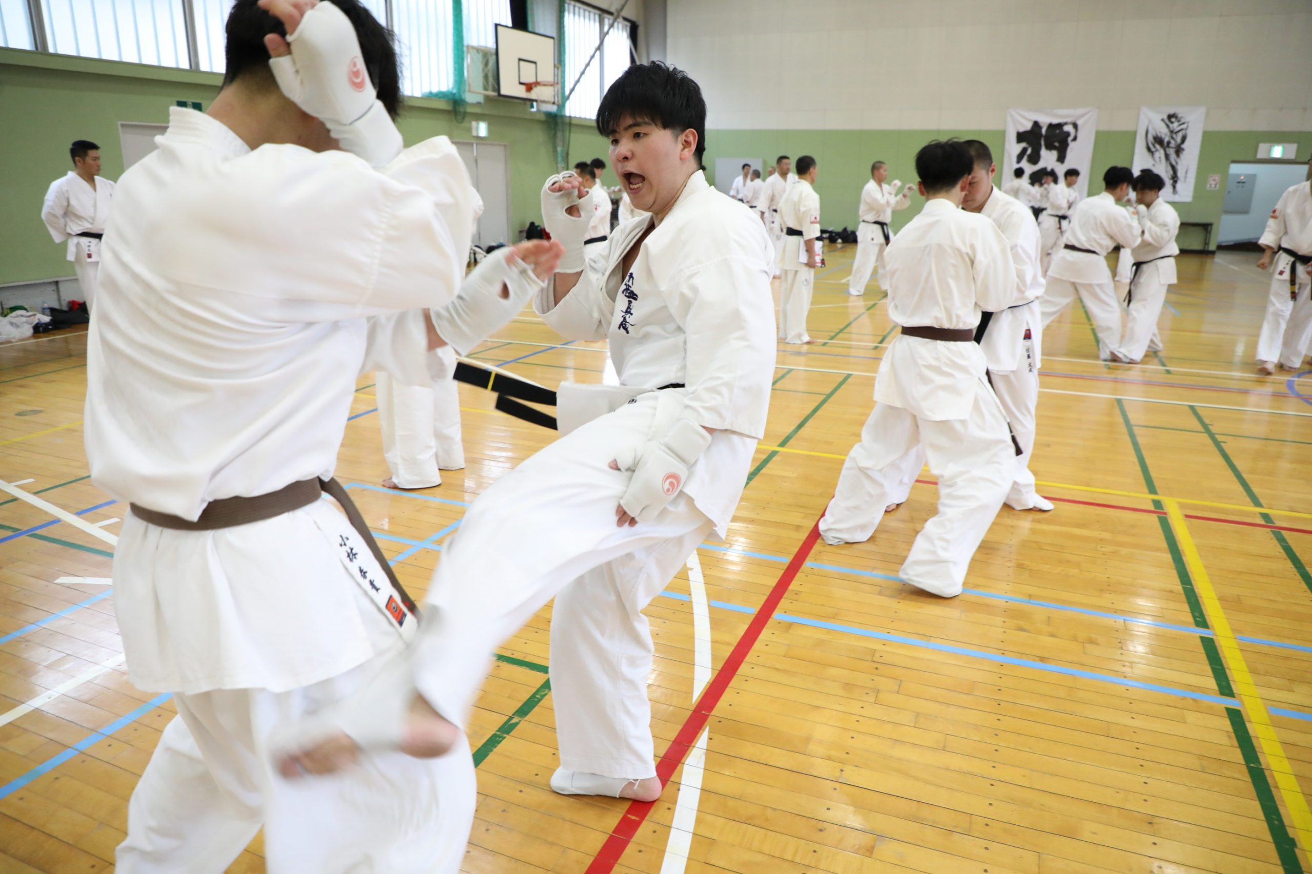 その後は男女とも階級別に分かれ、組手(1分5セット×4ラウンド、2分3セット×6ラウンド)を行なった。男女ともに試合さながらの激しい組手を展開した。