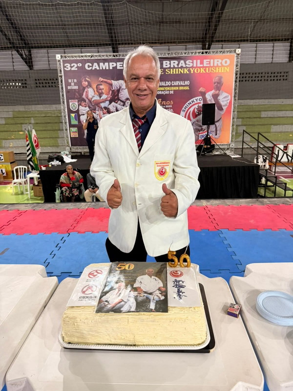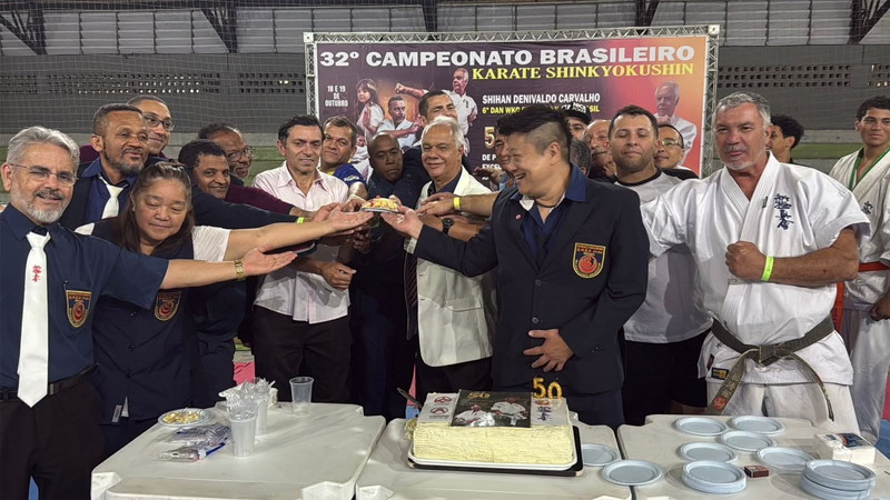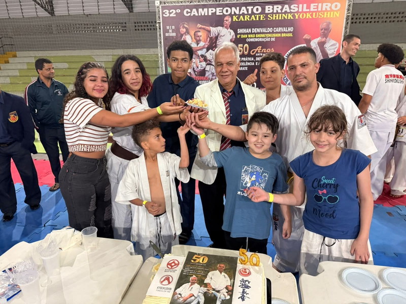 After the competition, a celebration took place to honor Shihan Denivaldo Carvalho’s 50 years of dedication to karate. The gathering brought together teachers and friends, featured a buffet of assorted refreshments, a karaoke session, and a specially decorated cake commemorating the golden anniversary.