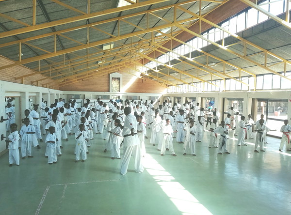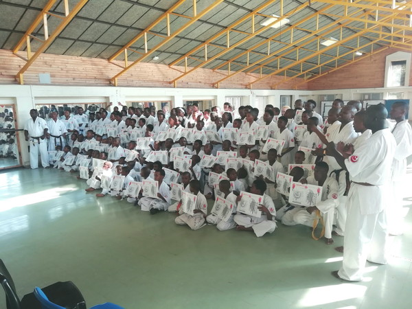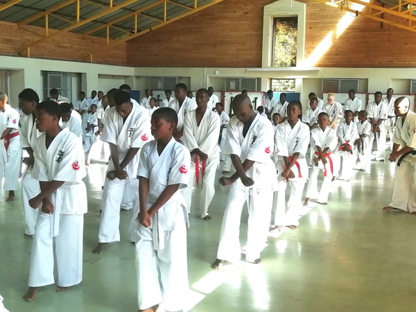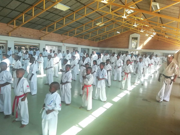 リンポポ州を中心とした各道場から120名が受審し、基本、移動、型、組手などの各項目で全力を尽くしました。WKOアフリカ地区のアイザック・マシニーニ委員長も特別審査委員として出席し、受審者、指導員のがんばりを称えながら、父兄や支援者への感謝のメッセージを送りました。
