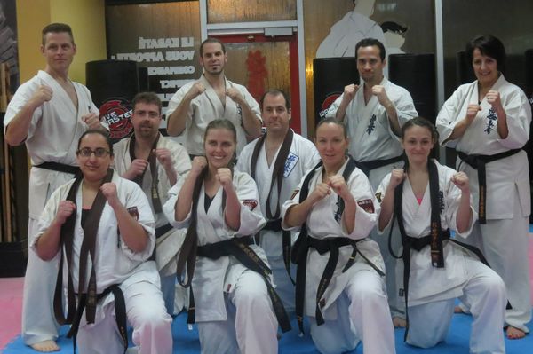 The candidates returned on Saturday, December 6th at 1 p.m., to continue their grading exam. More than 60 brown and black belt karatékas were present to encourage them, as everyone knew that this second step would be extremely demanding. The afternoon began with an intense cardiovascular training consisting of push-ups, sit-ups, frog jumps and more, followed by a series of kicks, the kihon, ido-geiko techniques and then wood breaking with both hands and feet. The grading test did not end there. In order to complete their black belt test, they still had to demonstrate their perseverance, their courage and their force of character in combats; 20 for the Nidan and 15 for Shodan. It was only at the end of the day and after each of the candidates were evaluated individually, that the six karatekas finally learned that they were successful and would be entering the realm of Yudansha.