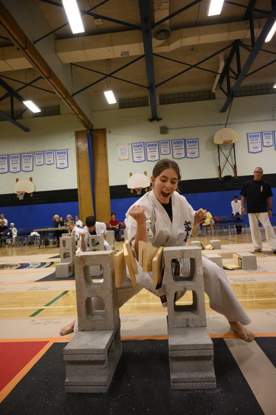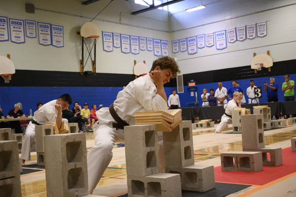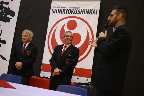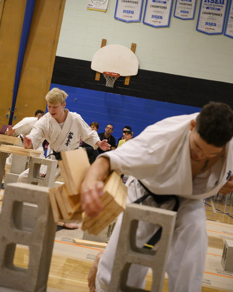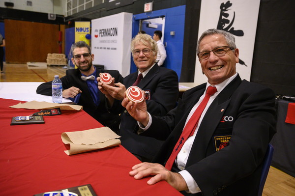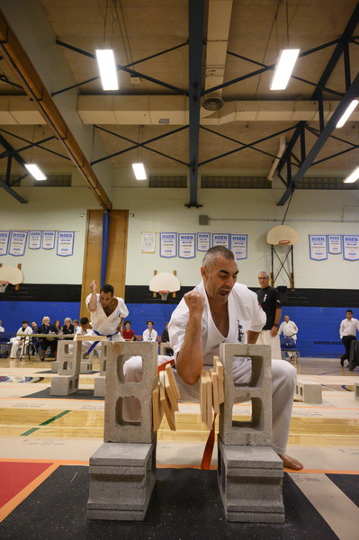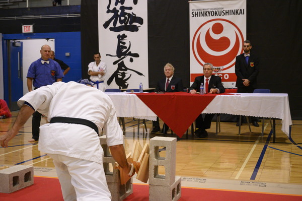 ケベック州内の道場やアメリカから集まった70名を超える選手は、試割板の枚数を自分で選び、割った枚数を競い合いました。カミーユ・オーハン支部長(六段)とアンドレ・ギルバート支部長(八段)もゲストとして参加しました。