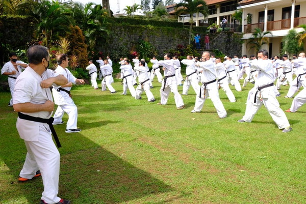 After the breakfast, all members trained Kihon and Ido together, then continued the training until 13:00, dividing into three groups. The participants, who would like to take higher Dan, repeatedly practiced new Kata for the next exam. Everyone enjoyed a group photo, and after lunch, the participants continued with the free program; swimming, taking walks in the city of Salatiga, enjoying the beautiful view from the hotel.