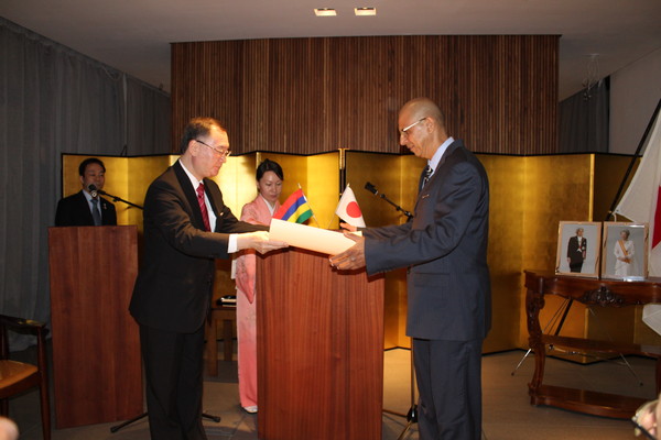 The conferment handing over ceremony took place at the Residence of the Ambassador of Japan, His Excellency Mr. Yoshiharu Kato, in the presence of the Vice Prime Minister & Minister of Local Government & Outer Islands, Mrs. Fazila Jeewa-Daureeawoo, the Lord Mayor of Port- Louis, Mr. Daniel Laurent, the Deputy Lord Mayor, Mr. Ehsan Mamode, members of the KMAF Mauritius and relatives.