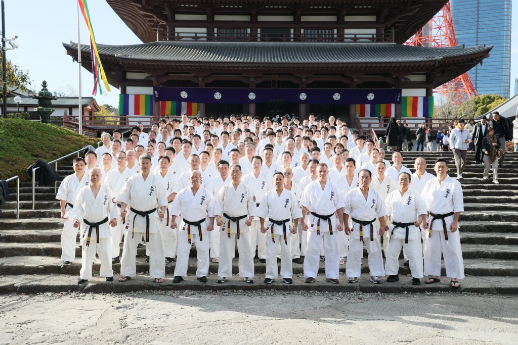 1月11日、東京を代表する名刹・増上寺にて鏡開き稽古会が開催された。総本部事務局を東麻布へ移転したことに伴い、今年は長年の開催地であった護国寺から場所を移しての実施となった。緑健児代表、小林功副代表、三好一男副代表をはじめ、関東近郊を中心とした支部長・道場長、第57回全日本大会の男女入賞者、さらにポーランドからレミギュシュ・カラピンスキー師範も稽古に参加。格式高い境内で、大勢の参加者が気合いのこもった稽古を行なった。