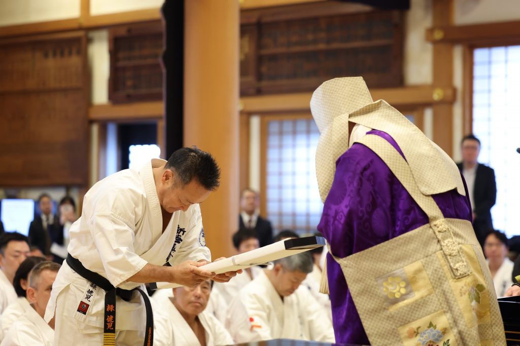鏡開き稽古会は安国殿での護摩供養から始まり、新極真会のさらなる発展を祈念。勝運のご利益を込めた黒特別札が緑代表に贈られた。