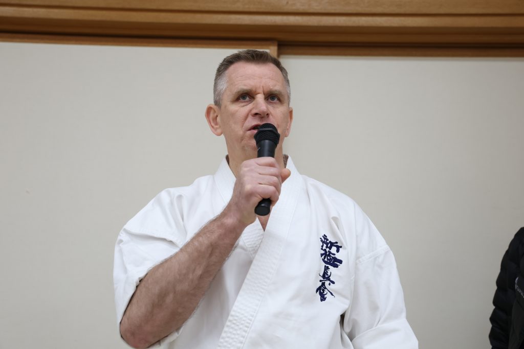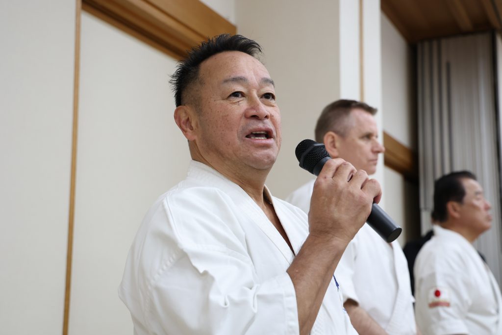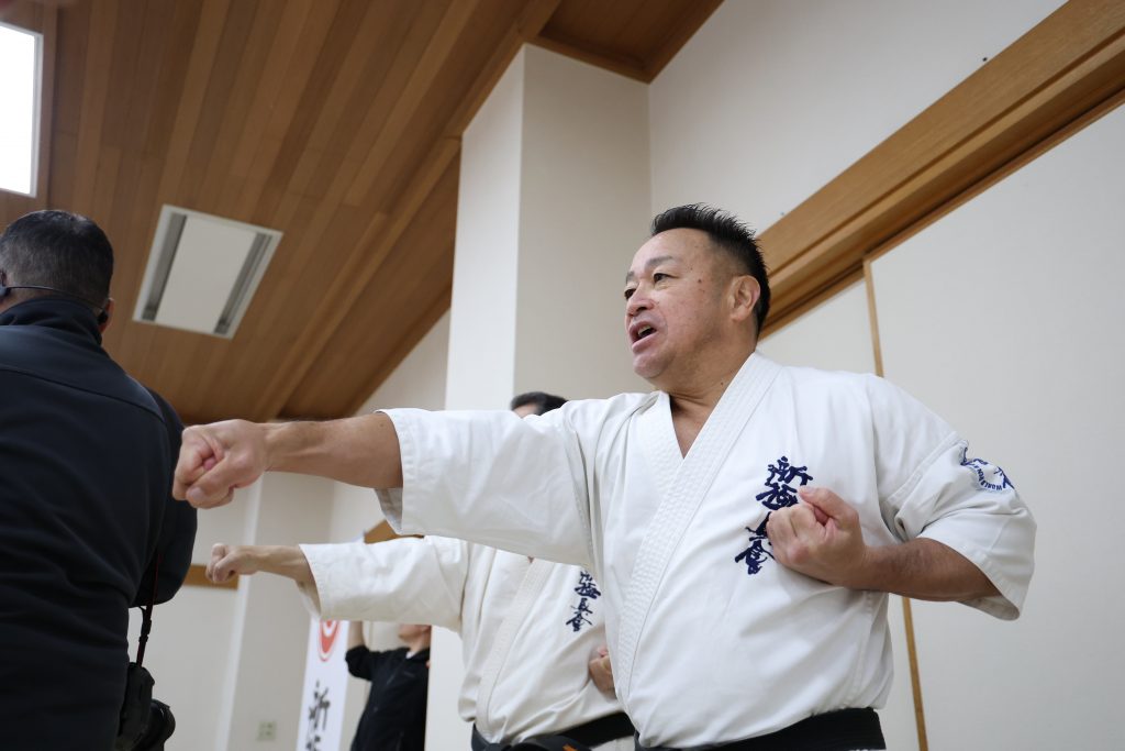 その後は屋外で写真撮影を挟んだのち、慈雲閣に場所を移して稽古を実施。緑代表は新年の挨拶とともに、「この稽古を全力で行なうことには、1年間、みなさんが全力で稽古に取り組むという意味合いもあります。大会で言うと、今年は3月にJFKO青少年大会があります。子どもたちも勝てるように各支部・道場の先生方は一生懸命指導してください。そして、5月のJFKO全日本大会では新極真会が上位を独占しましょう。男子重量級のチャンピオンは7月のKCCに出場できるので、他の階級はもちろんですが、とくに重量級は新極真会の選手が必ず優勝できるようにがんばってください。10月の全日本大会は世界大会の選抜戦になります。来年の世界大会では何としても男女ダブル優勝して、伝統を崩さないようにがんばっていきましょう。ここまで選手のことばかり話しましたが、老若男女のみなさんが新極真空手を通して健康でいてくれることが一番大事です。全力で、そしてどんな困難が来ようとも乗り越える。そんな1年になるようにがんばっていきましょう」とメッセージを送った。