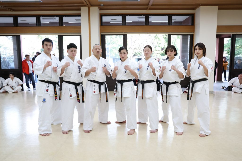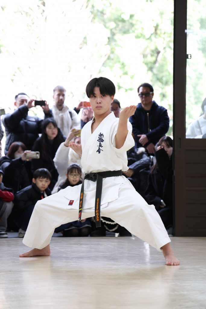 奉納演武の後は、鏡開き稽古会に参加した第2回空手Champion of Championsの日本代表メンバー(岡田侑己、渡辺和志、渡辺優作、鈴木未紘、藤原桃萌、目代結菜、網川来夢)が紹介され、代表して第1回大会王者の岡田と鈴木が思いを語った。