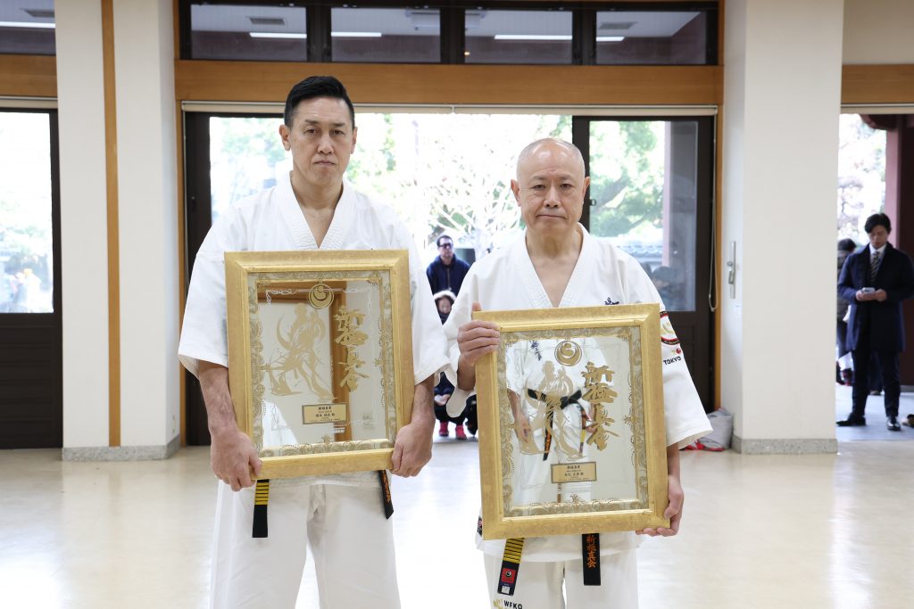 稽古会の締めくくりに新極真賞の贈呈式が行なわれた。受賞者は2025年4月の交通事故で左脚を切断する重傷を負ったものの、リハビリを経て第57回全日本大会で復活の演武を披露した木元正資師範。そして、関東合同強化稽古をはじめ選手育成に尽力し、各大会での経済的な支援でも組織に貢献した塚本徳臣師範に緑代表から記念の盾が贈呈された。緑代表は両者に惜しみない賛辞を贈り、鏡開き稽古会が閉幕した。