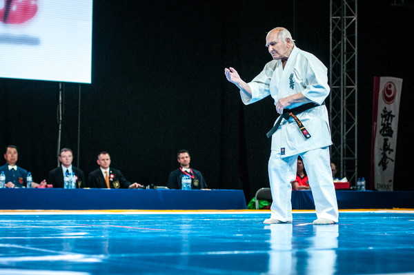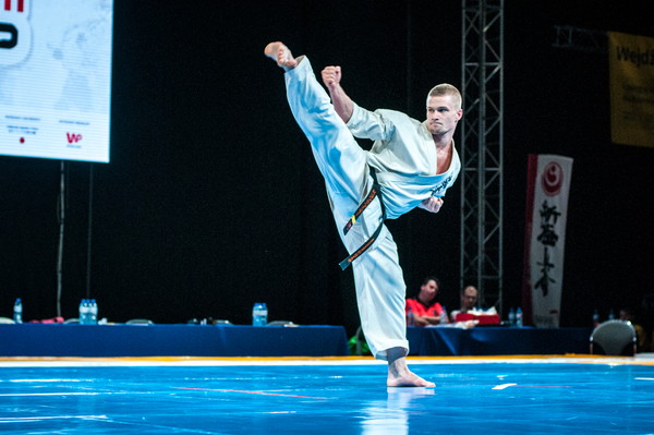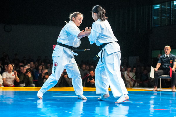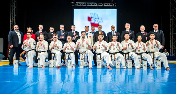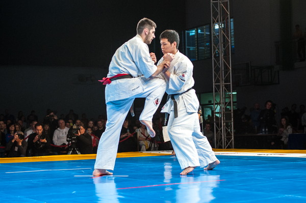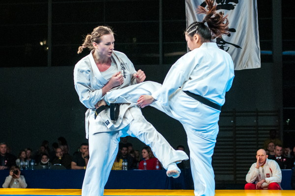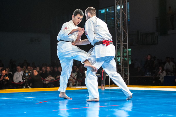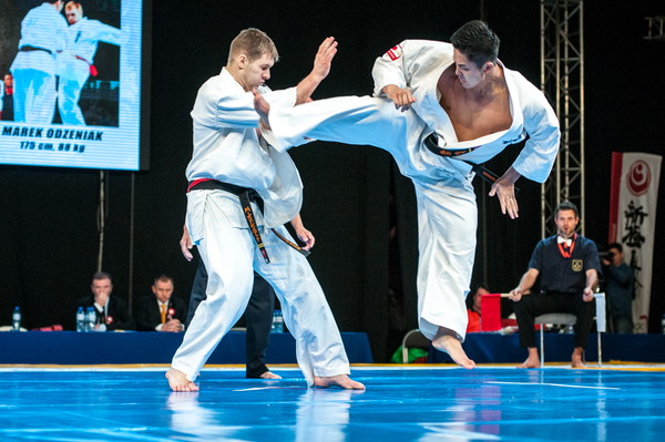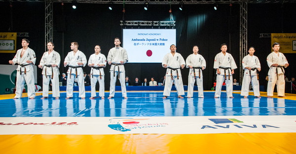 今大会はポーランド独立100周年、日本・ポーランド国交樹立100周年を記念して日本対ポーランドのワンマッチ大会として開催しました。5対5で勝者が3ポイント、引き分けが1ポイント、敗者が0ポイントで最終的なポイント数を競いました。日本の小林功副代表、谷川光支部長が特別ゲストとして出席し、小林副代表は主審、谷川支部長は選手のコーチを務めました。試合の合間には指導員&少年部の演武が行なわれ、会場を盛り上げました。