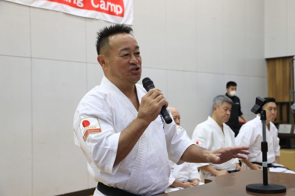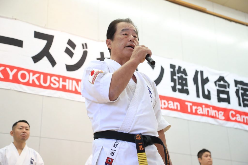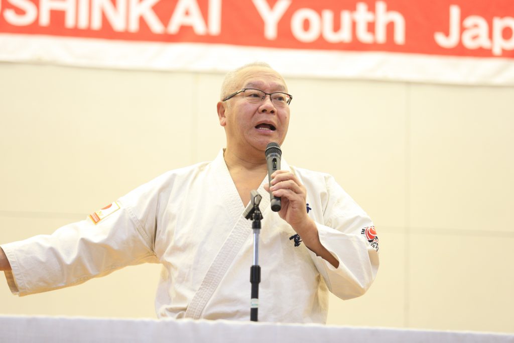 続いて三好一男副代表が登壇し、「強く優しく、マナーも素晴らしいのが新極真会の選手です。これから2泊3日一生懸命稽古して、食事も好き嫌いせずにしっかり食べて、健康で強くなって帰るのが家族への一番のお土産になると思います。この合宿で自分を磨いて、将来は世界チャンピオン、全日本チャンピオンになってほしいと願っていますのでがんばってください」と合宿に臨むユースたちを鼓舞した。