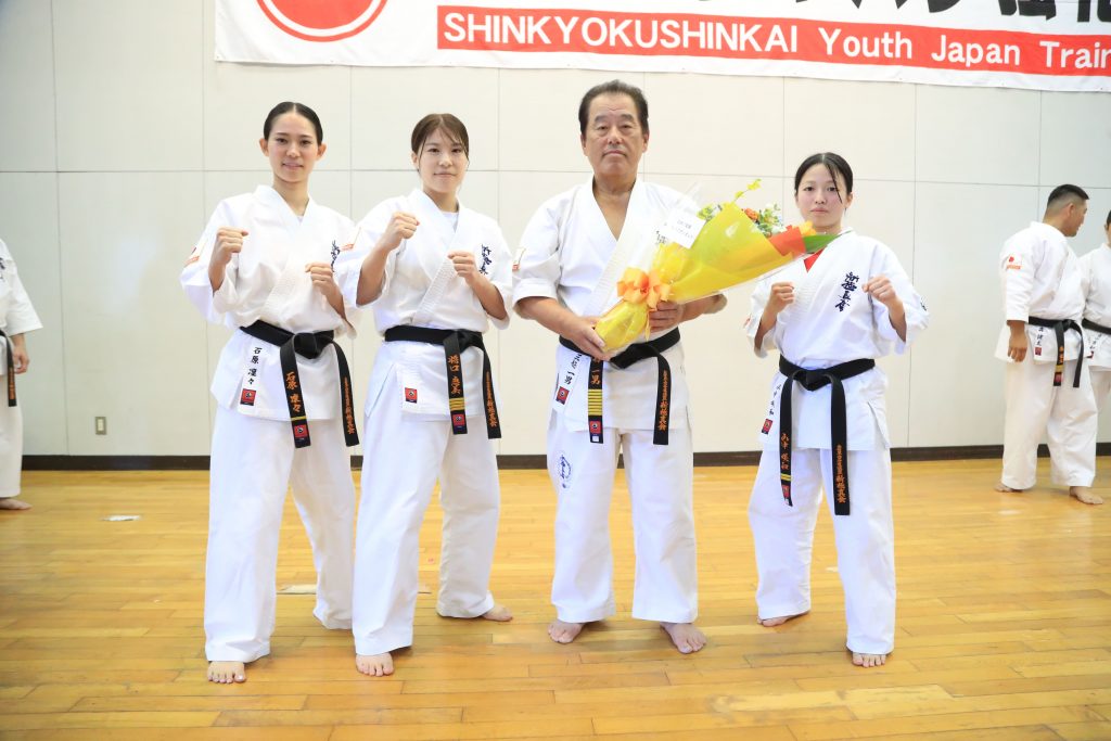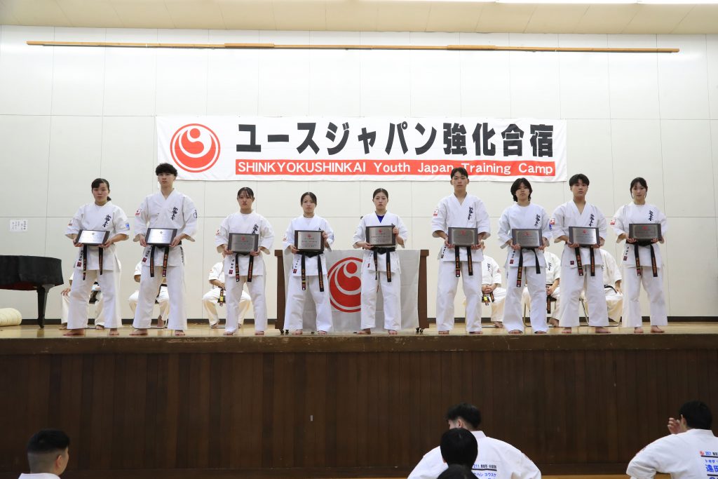 その後はユース特別賞が発表され、第57回全日本大会で入賞、第1回WFKO世界大会および第2回JFKO国際大会で優勝をはたした面々に記念の盾を贈呈。鈴木、塚本、漢鈴那、山中咲和、澤井ナノ、大坪星太、伊藤煌彩、角野、星が一枚の写真に収まった(北嶋治将は仕事の都合で2日目から合宿参加のため登壇せず)。