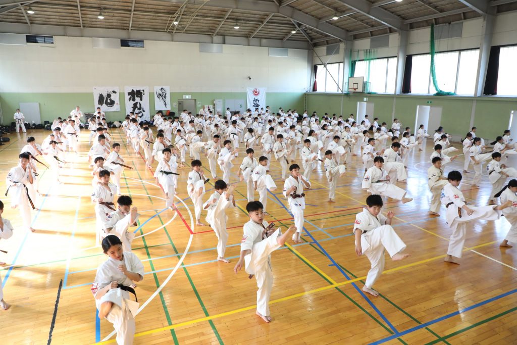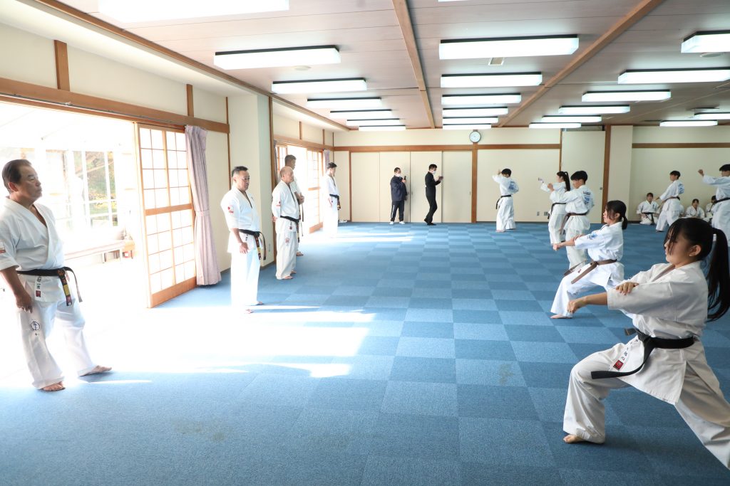 稽古が幕を開けた。「空手の命は組手にあり。組手の命は基本にあり」と緑代表が檄を飛ばすと空気が一段と引き締まり、基本稽古がスタート。エネルギーに満ちた声が休暇村体育館に響いた。