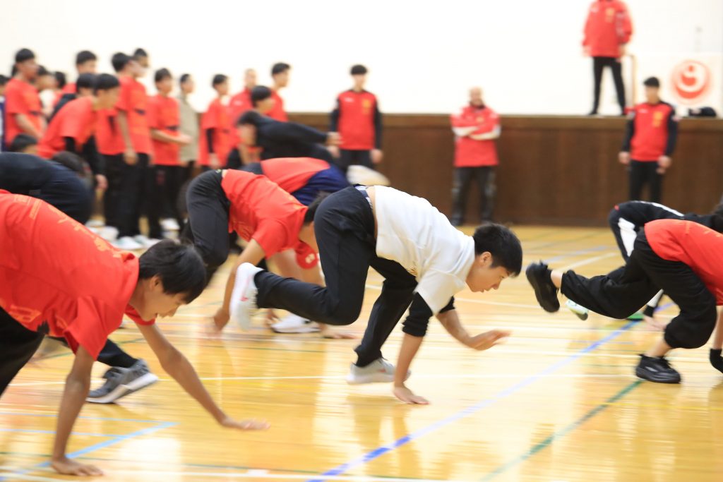 合宿2日目は、組手U-19とU-15選抜選手のみが参加する早朝稽古から幕を開けた。ランニングで体を温め、2人組でしっかりとストレッチを行なったのち、チーム対抗でダッシュ、両足ジャンプ、くま歩き、タランチュラなどのメニューを実施。各種目で最下位のチームには拳立て10回が課せられた。