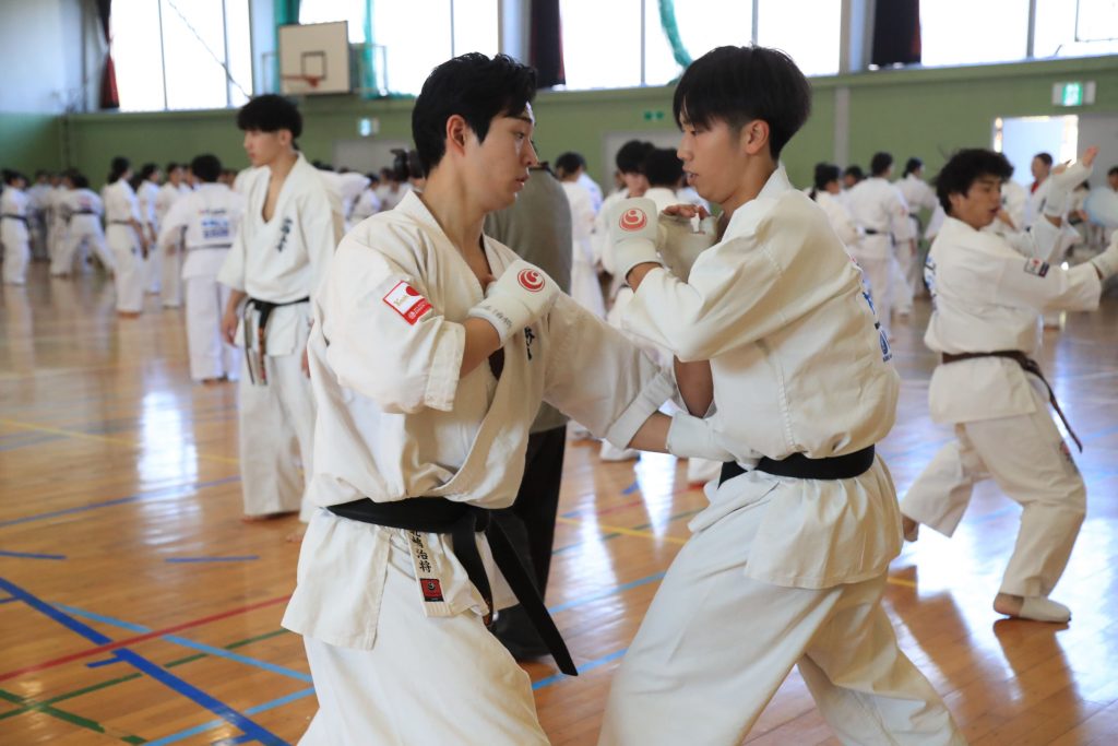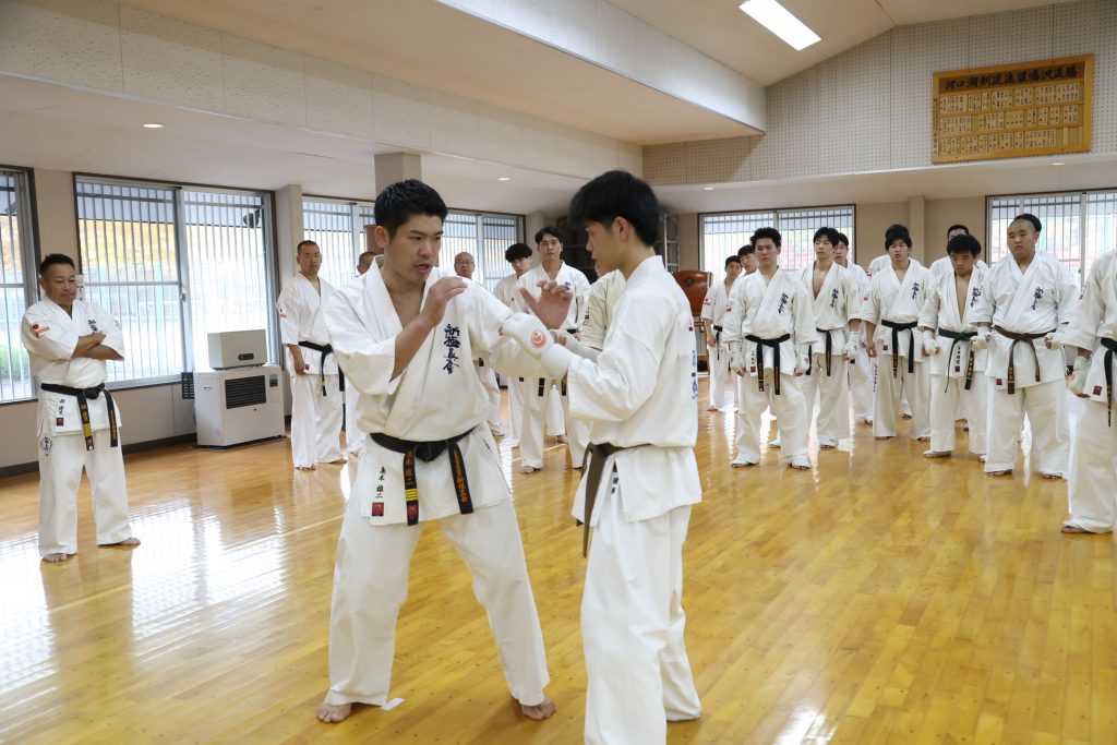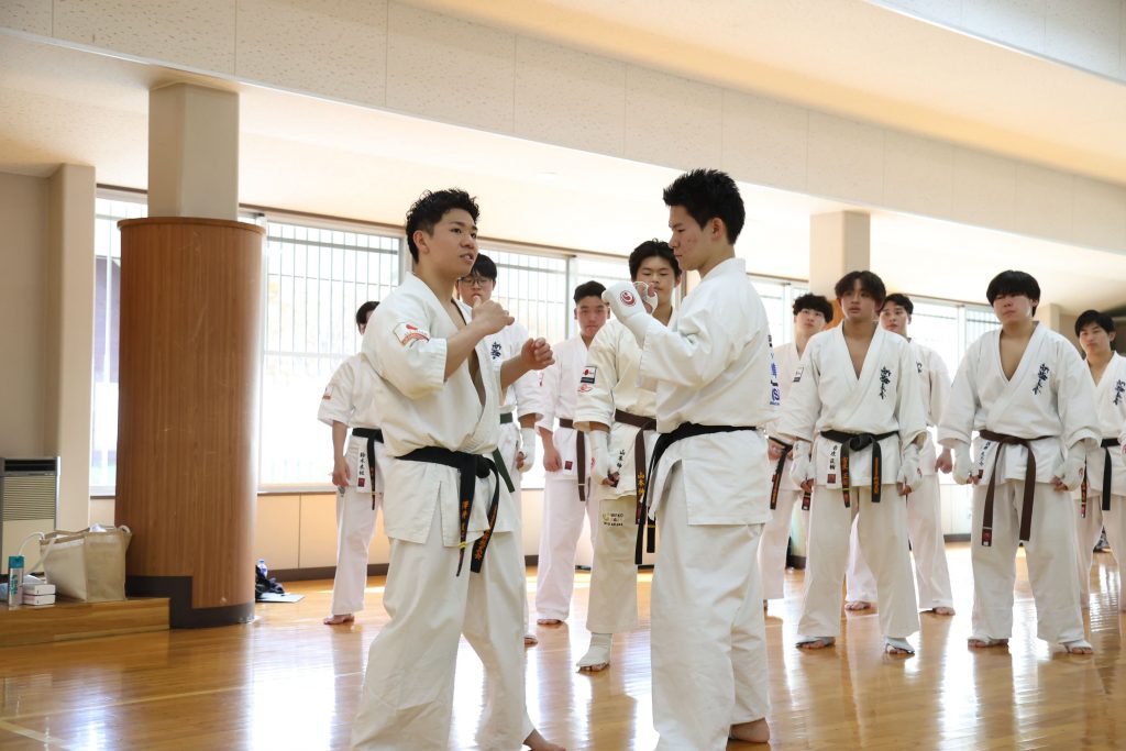 合宿最終日は早朝稽古からスタート。2日目同様ランメニューを行なった。朝食を挟み、合宿の締めくくりとなる午前稽古を組手と型で2箇所に分かれて実施した。