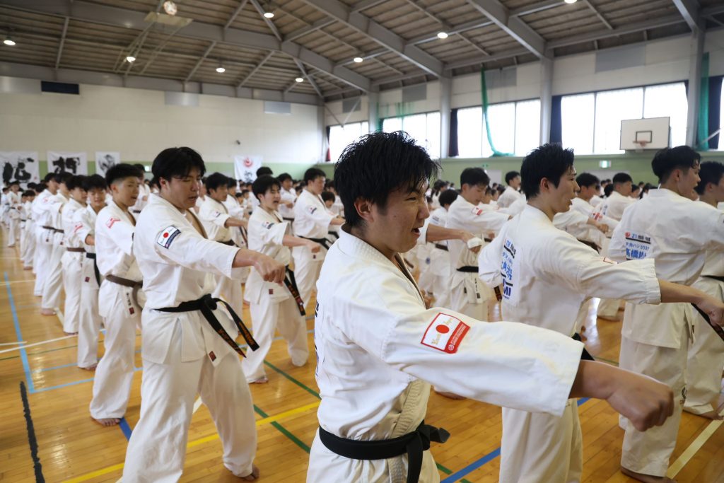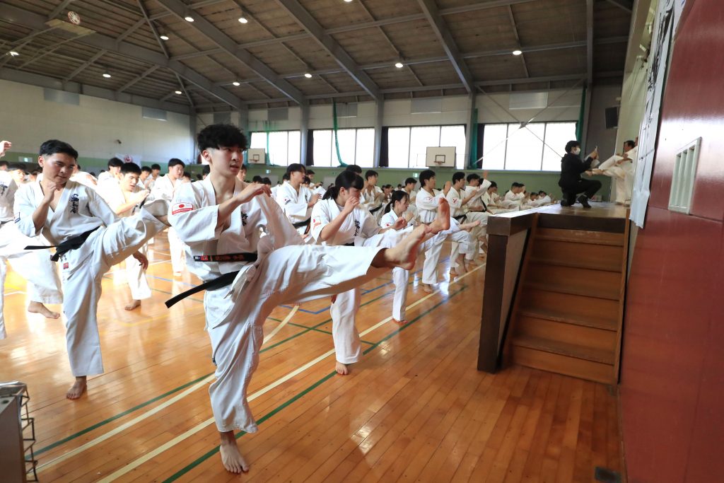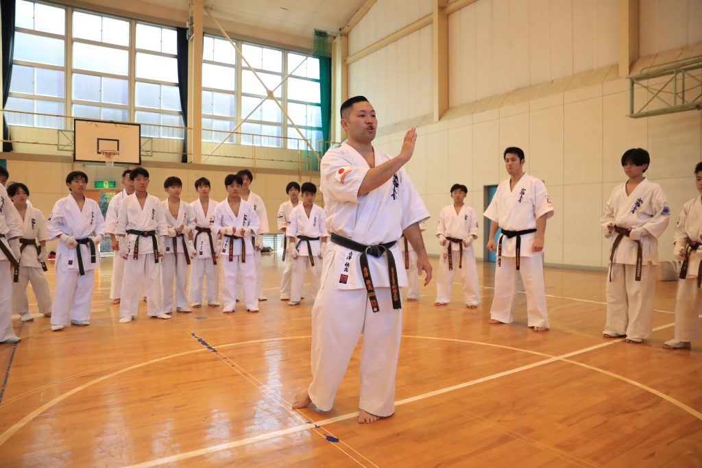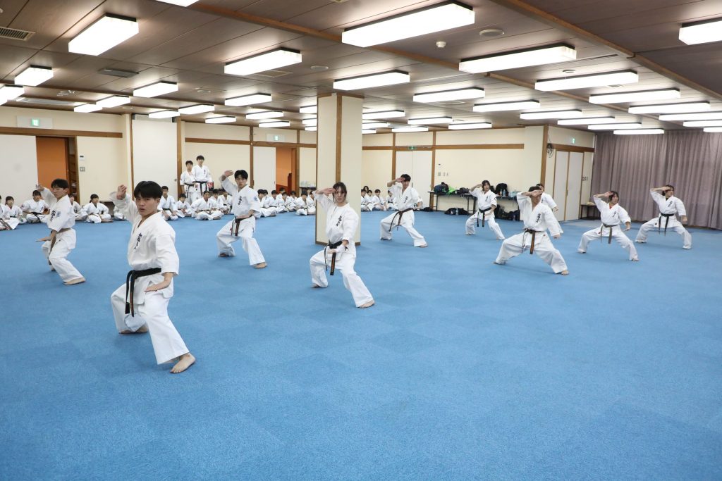 型の稽古はグラウンドからスタート。藤原康晴師範、外舘慎一師範、渡邊大士コーチの指導のもと、各々が型を研ぎ澄ませた。グラウンドでは全体で平安1を号令ありで実施。立ち方、姿勢など細部まで確認し、室内ホールへ移動した。