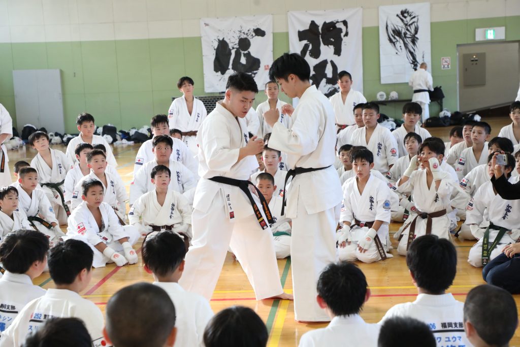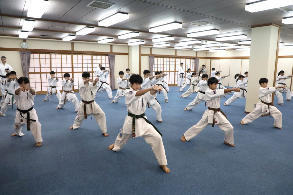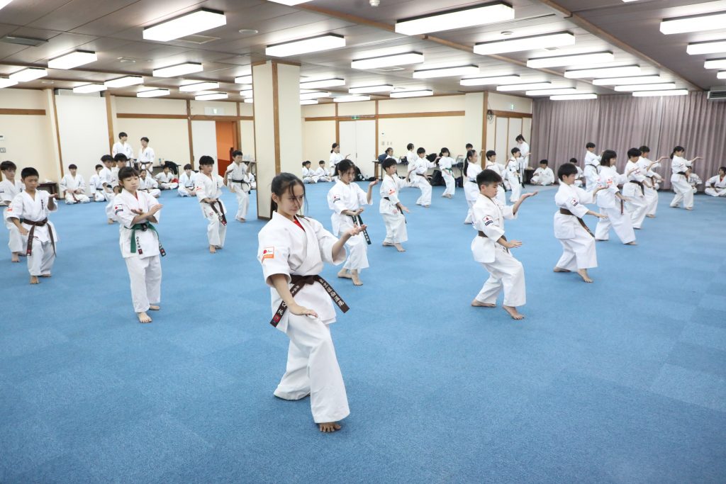 緑代表、三好副代表が稽古に訪れた際には、選手たちが型を披露。小学生が突きの型、中学生は十八、高校生は五十四歩と、磨き上げた演技をしっかりと見せた。型を発表したのちにユースサーキットを行ない、型の稽古も終了した。