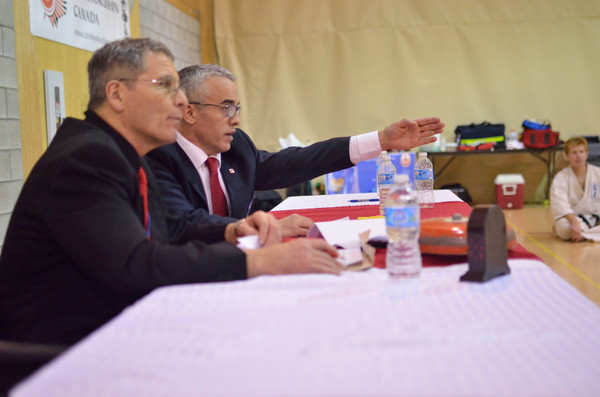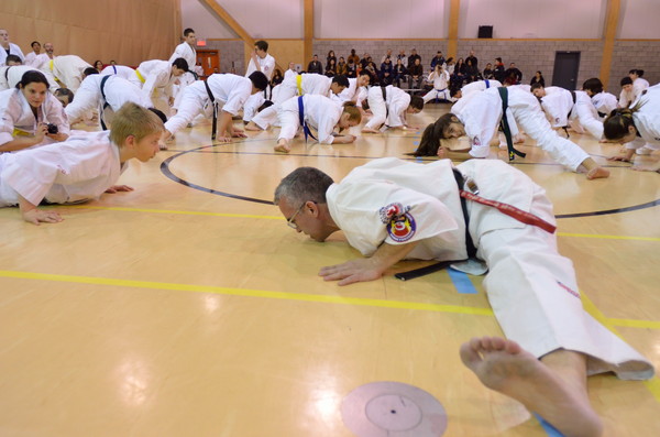 The fifteen candidates then had a few hours to rest before the seven hour intense exam. The exam started with a general warm-up given by Shihan Talán, after which Shihan Ohan continued to orchestrate the exam dividing groups based on age and belt level where all the candidates were tested on all aspects of Shinkyokushin criteria. Sitting on the grading committee was Shihan Jesus Talán, Shihan Camille Ohan, Shihan Guy Salter, Shihan Alain Bordeleau, and Sensei Normand Bordeleau. During the exam, Shihan Talán occasionally asked some candidates to perform specific katas, or techniques. The exam included tameshiwari and self-defense.