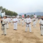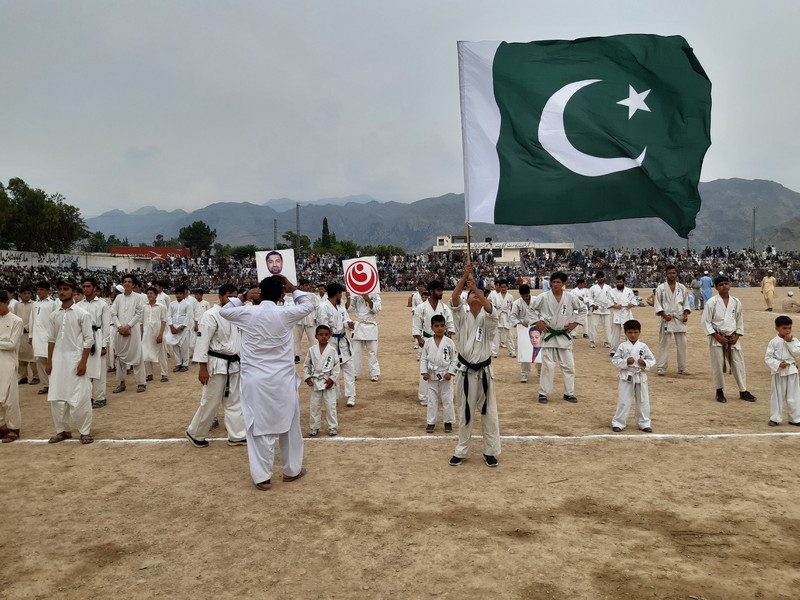 8月14日のパキスタン独立記念日を記念して、カイバル・パクトゥンクワ州政府が毎年スポーツ祭を行います。今回パキスタン・シンワリ支部がこのスポーツ祭の開会式での演武を依頼され、40名以上の生徒が、集まった大勢の観客の前で演武を行いました。