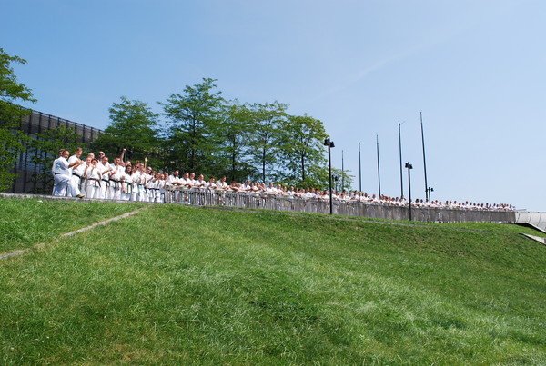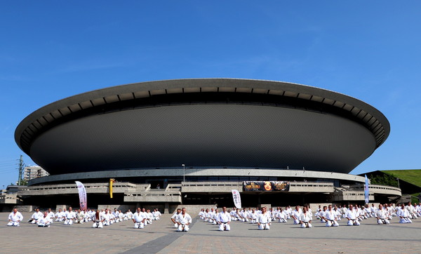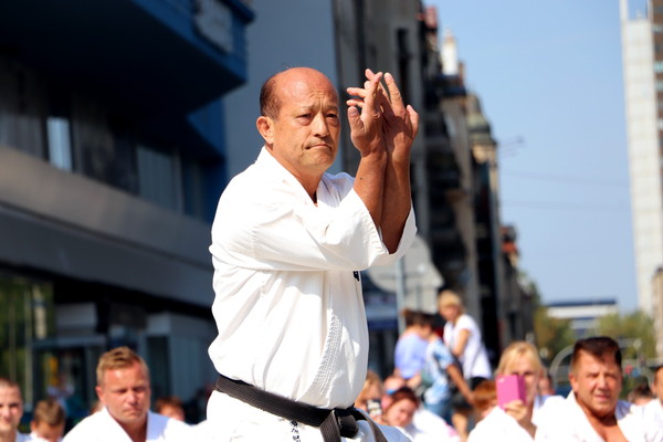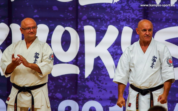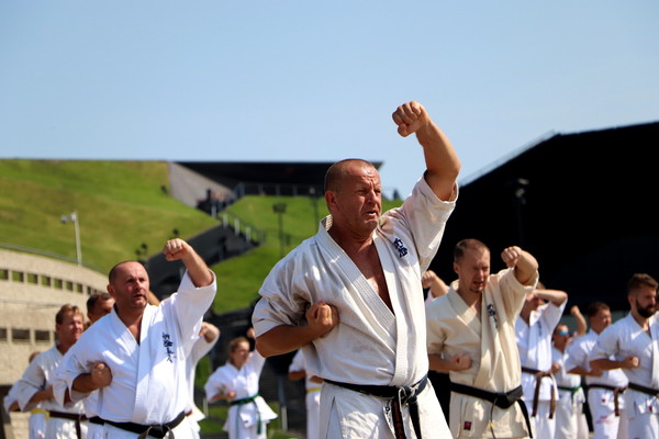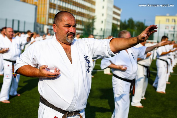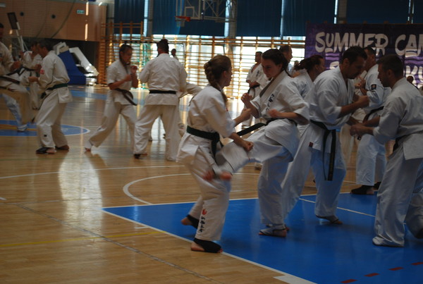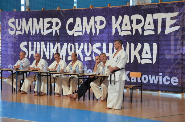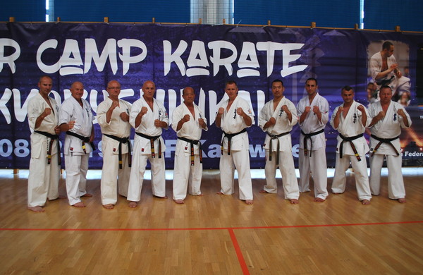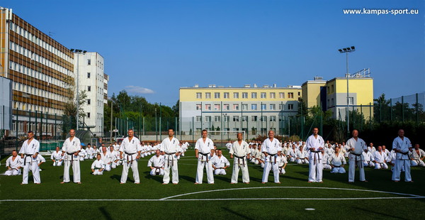 日本の藤原康晴師範、村山努支部長、ヴァレリー・ディミトロフ支部長を特別ゲストとして迎えたサマーキャンプを8月22日~25日、カトヴィツェで開催しました。6カ国から186名が参加し、基本、移動、型、組手の厳しい稽古に全力で取り組みました。キャンプの前にはカトヴィツェ市長と面談し、観光ツアーも行ないました。キャンプ中、44名が昇級昇段審査に挑戦しました。受審者を対象とした事前稽古も十分に行ないました。キャンプの終盤にはカトヴィツェ市の中心地で公開稽古を行ない、テレビ局の取材を受けていいPRになりました。