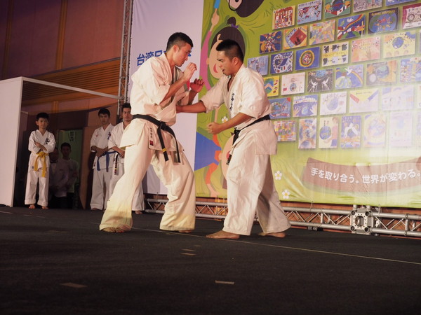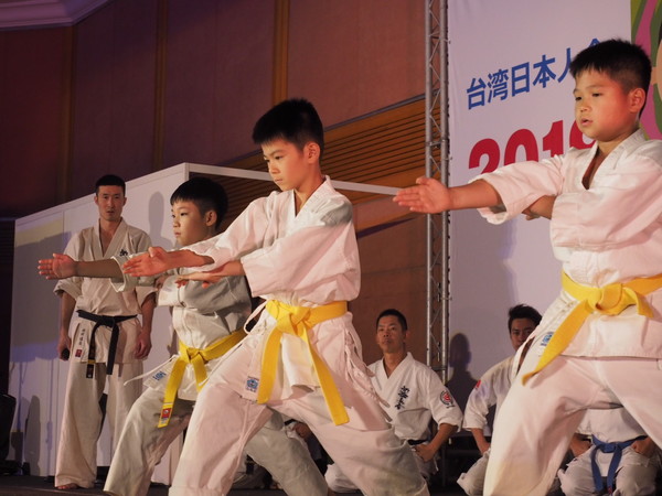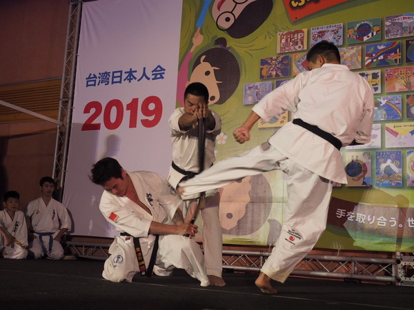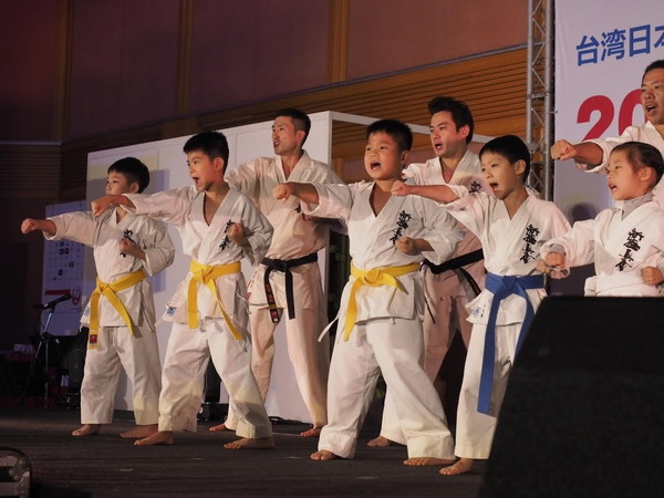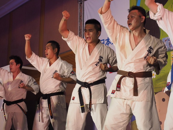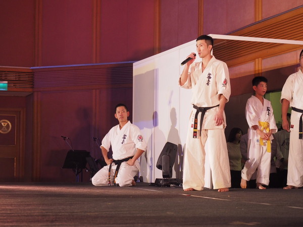 台湾支部各道場から約20名が参加して基本、移動、少年部による型と四方割、組手、そして一般部黒帯によるバット折りを披露し大いに盛り上がりました。
