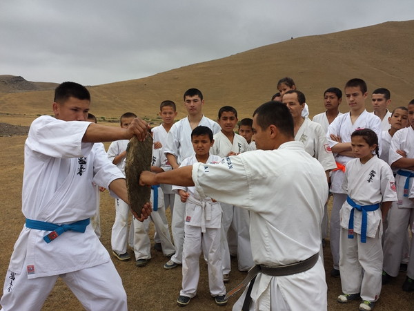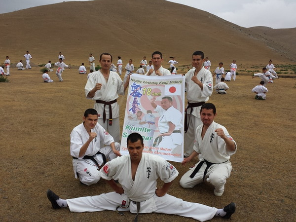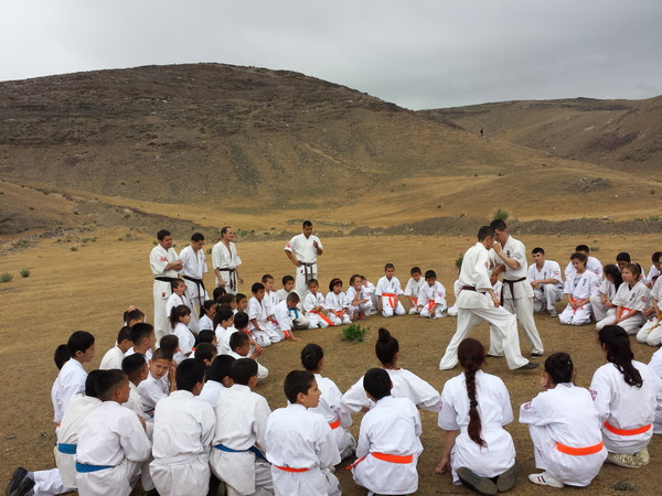 Fortunately, the rain stopped when they reached Ziyadin Mountains after going on foot 6 km and climbed to the top of the mountain (height 200 m). The Kumite seminar was held on the mountains in Samarkand region with eighty Karatekas from three Dojos. The trainer-instructors showed techniques of Kumite to the young boys and girls. The two hours training was held successfully and the Karatekas enjoyed training in the nature.