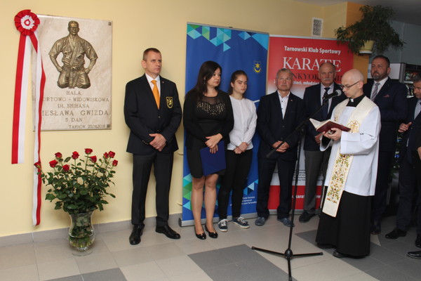 The memorial plaque was blessed by Father Rafał Łukasik. The profile of Wiesław Gwizd was introduced by Sensei Janusz Wdowiak, the current President of Tarnowski Karate Club. Shihan Remigiusz Karpiński and Sensei Wojciech Radziewicz also made the speech.