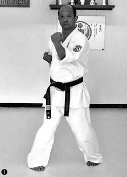 1. 正中線を軸に体を回転させながら、左ヒジを直角に曲げ、脇をしっかり締めて左拳を胸の前に置く。拳は肩の高さで、脇とヒジの間は拳ひとつ分あける。右腕は引き手
