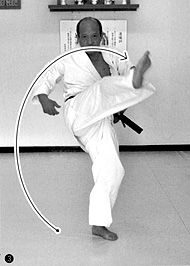 2.右足の親指を返して足刀を作り、外から旋回させながら、親指の付け根からカカトまでの部分で相手のコメカミを蹴る。また、相手の攻撃を底足で受ける際にも使われる。ヒザが曲がらないように注意しよう。